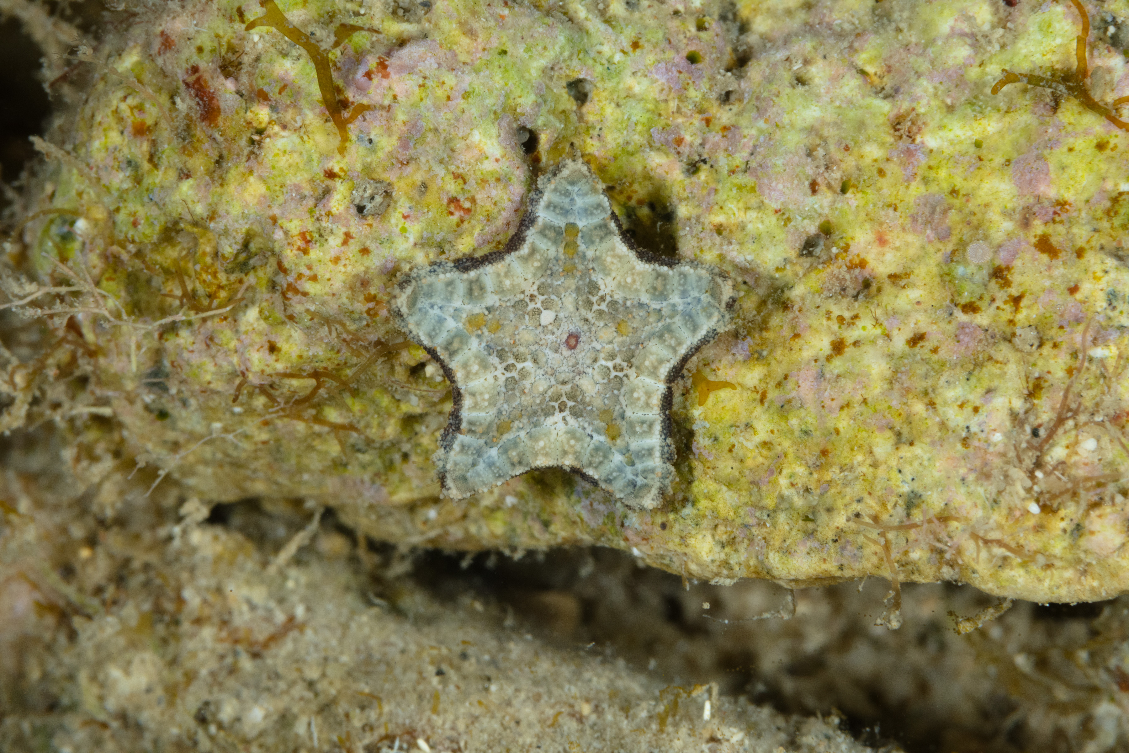 The Tessellated Cushion Star lives on rocky or sandy bottoms. Its name comes from the star's patterned surface, which resembles a mosaic or tessellation.