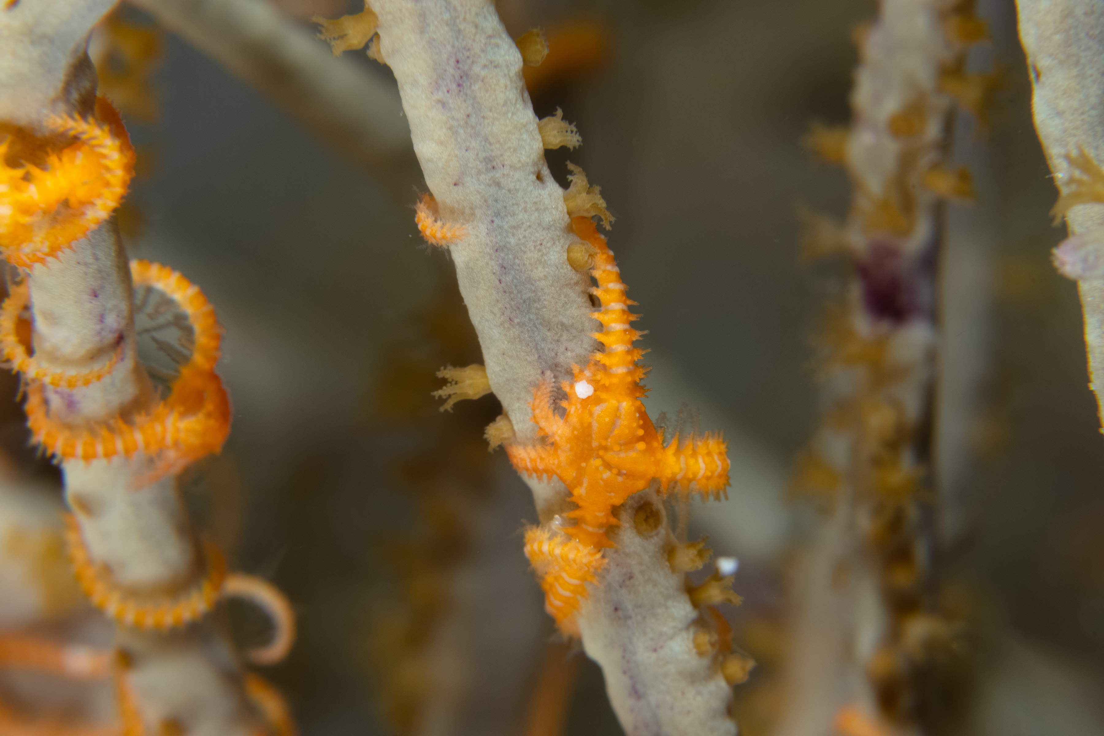 This Brittle Star has a small disc with six spiny yellow-orange arms. The arms often wrap around Gorgonian branches.