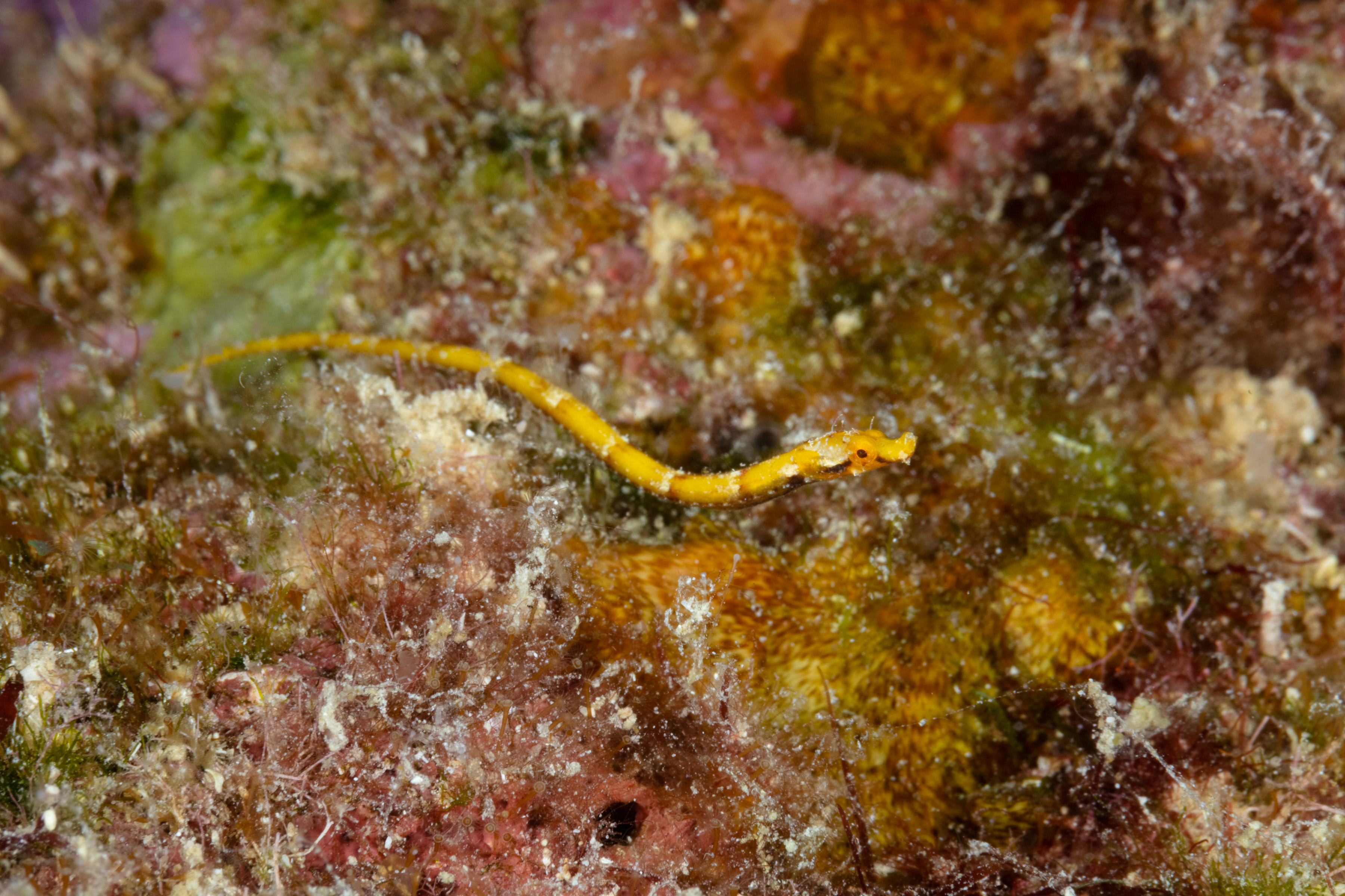 The Banded Pipefish has a long, slender body that is yellow, orange, brown, or black with bands encircling it. The body color is highly variable and may show pale bars, irregular patterns, or alternating bands of light and dark. Its body is snake-like, and its snout is short. One or more spines may be visible on its head. Juveniles are smaller but have a similar appearance.