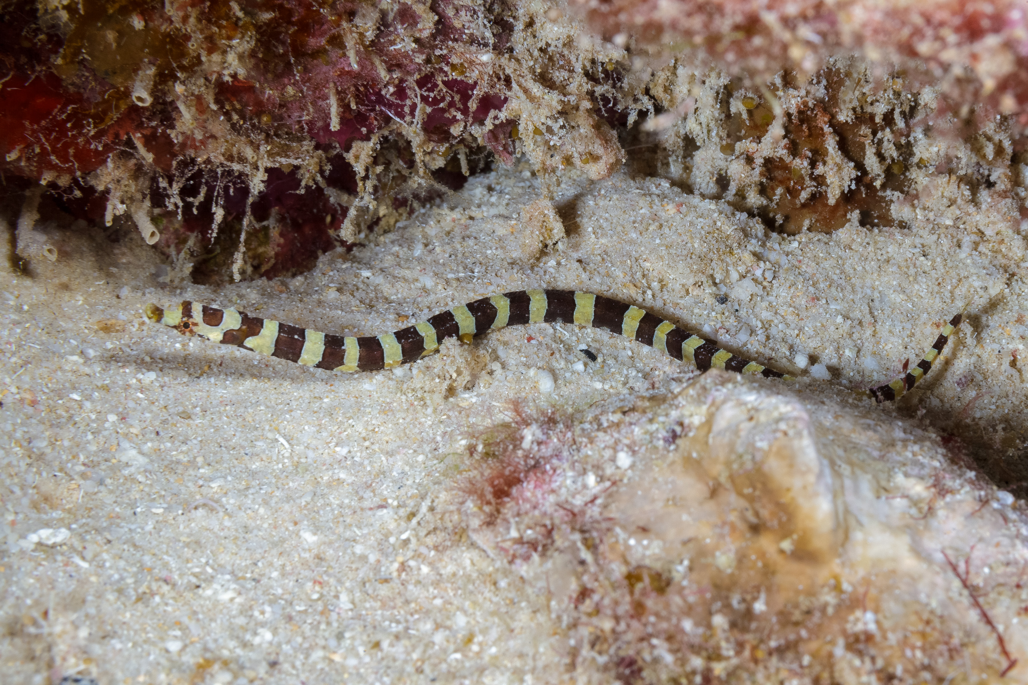 This Pipefish can be found alone on the reef, in crevices, on sponges, and among coral rubble. It feeds on small crustaceans and other tiny invertebrates, which it sucks in through its tube-like snout. Like other Pipefishes, the male is responsible for carrying and nurturing the eggs. The Harlequin Pipefish was previously grouped with the Banded Pipefish. It differs by having bold yellow and brown bands. Despite these differences, both species share identical DNA sequences, and their classification as distinct species remains unresolved.