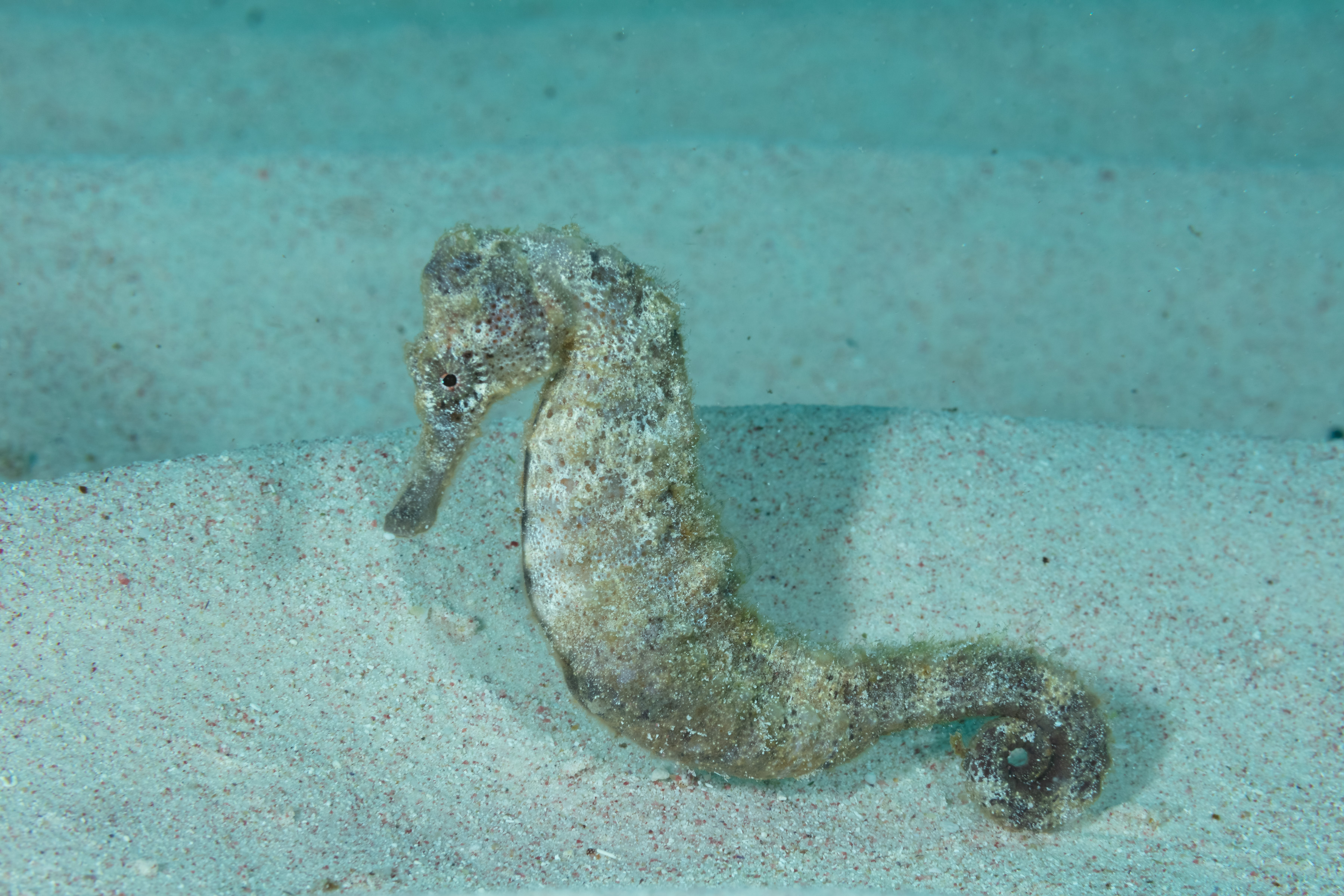This Seahorse is usually found alone, and sometimes in pairs. It can be seen in shallow waters or on the reef, where it holds on to Gorgonians, Coral, or Sponges with its grasping tail. It is not shy and typically remains still when approached, sometimes turning its head away. The Longsnout Seahorse is a stealthy predator, using its long snout like a pipette to suction up tiny crustaceans, which it hunts throughout the day. A unique aspect of its reproduction is that the female deposits her eggs into a pouch just below the male’s abdomen. The male fertilizes the eggs and carries them until they hatch and are released as fully formed juveniles. They are typically monogamous, meaning a pair will mate for life.