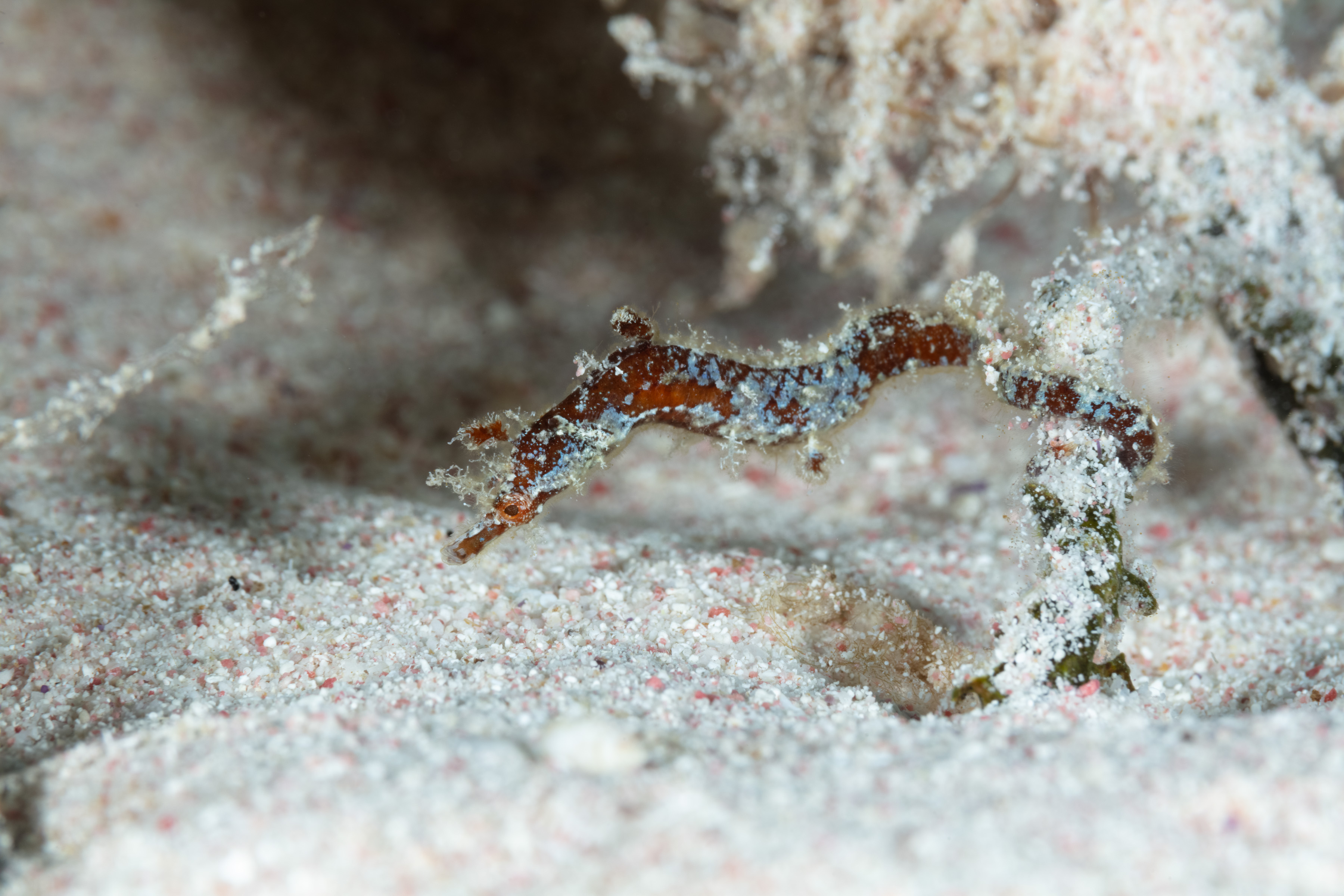 The Pipehorse is most often seen in shallow, sandy areas, sometimes in pairs, though it can be found deeper on the reef. It has also been observed drifting in open water within large mats of Sargassum seaweed. The Pipehorse feeds by using its long snout to suck up small crustaceans and other tiny invertebrates that float past in the water. Like its relatives, Seahorses and other Pipefishes, the male is responsible for carrying and nurturing the eggs. When the eggs hatch, the juveniles are released into the water to live as part of the plankton before settling.