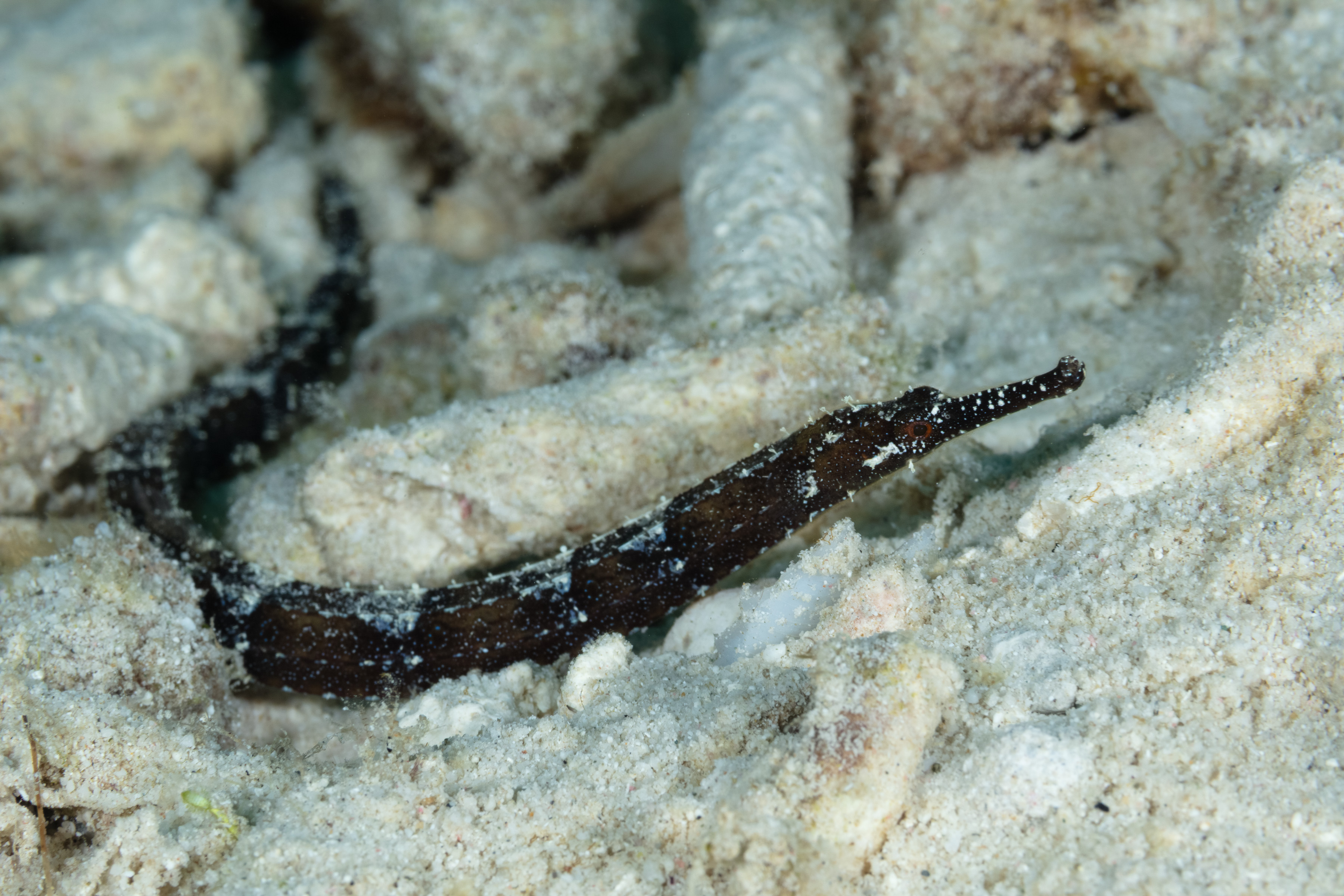 This Pipefish is often found alone, typically in shallow water on sandy bottoms, among seagrass beds, or around coral rubble. It is shy and cautious, and actively feeds during the day, using its long, narrow snout to suck up small crustaceans and plankton. Like other Pipefishes, the male is responsible for carrying and nurturing the eggs.