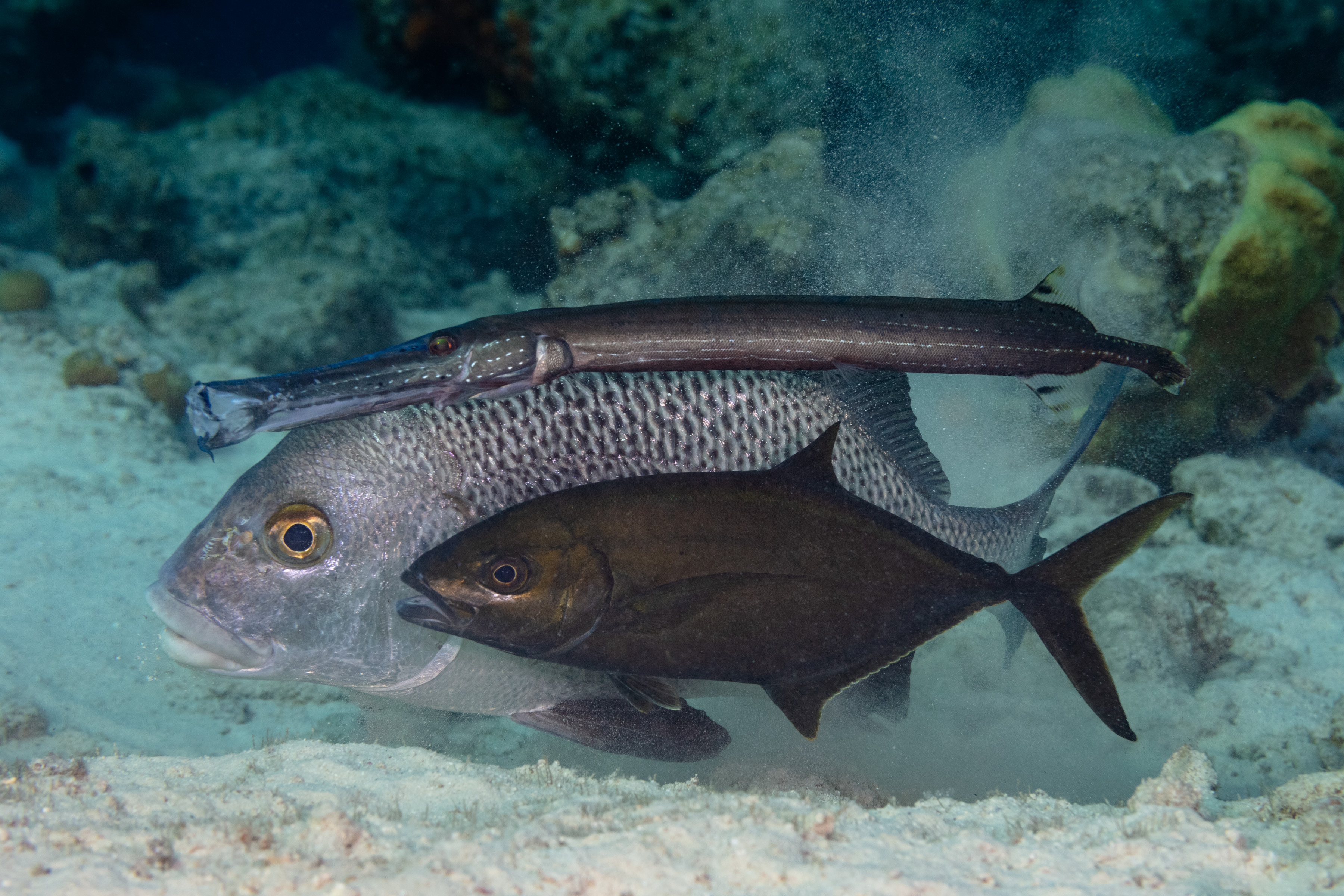 In this photo, the Bar Jack and a Trumpetfish are following a Black Margate to feed on prey stirred up from the seafloor. This opportunistic behavior is known as commensal feeding.