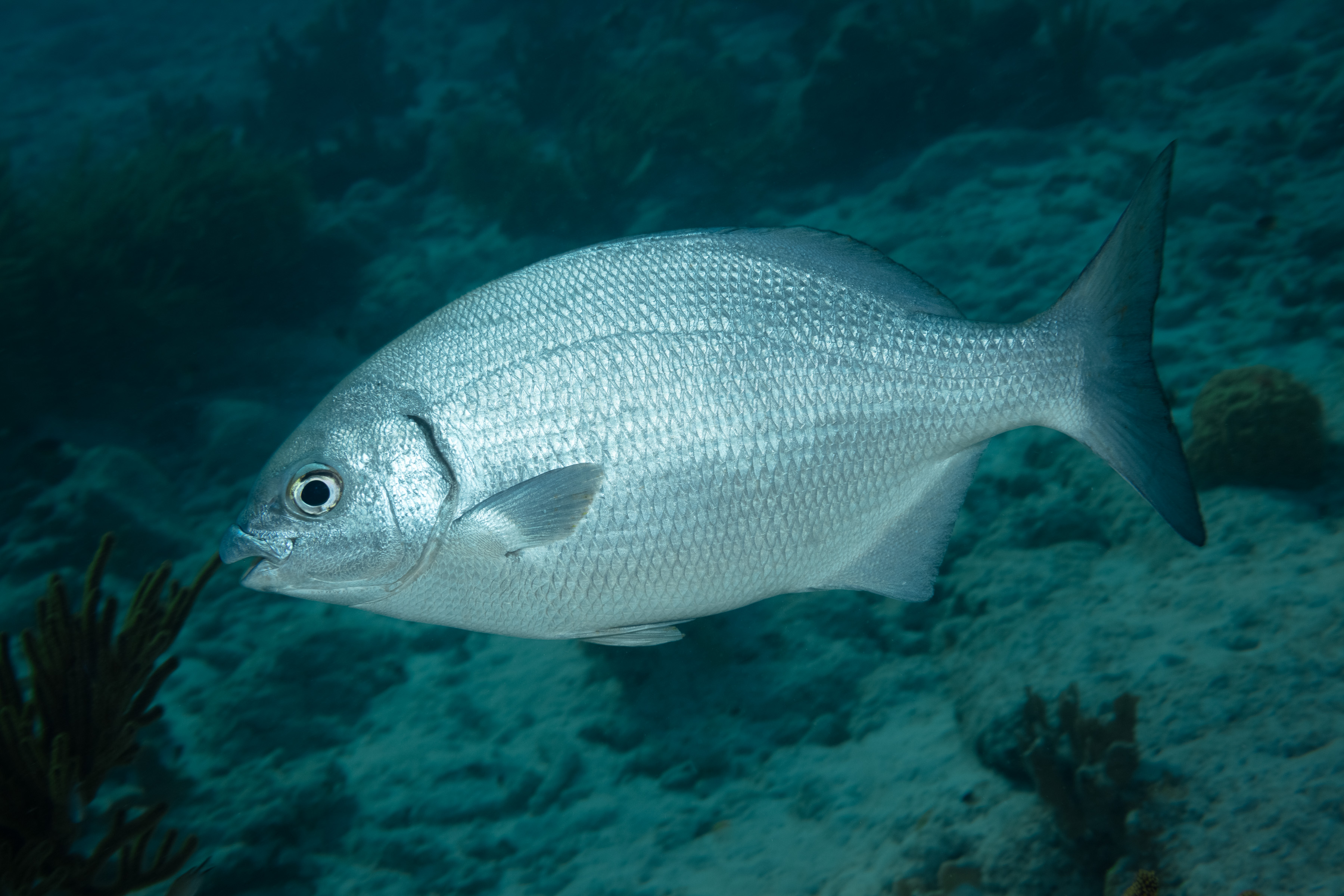 The Bermuda Gray Chub is also known as the Bermuda Chub or Gray Chub, based on regional common names and its silvery-gray appearance. It is often found in small, mixed groups near the water's surface when feeding. They eat algae and small invertebrates like crabs and mollusks. They are curious and sometimes come close for a quick look before swimming away. Juveniles are known to drift under floating debris, buoy ropes, or seaweed.