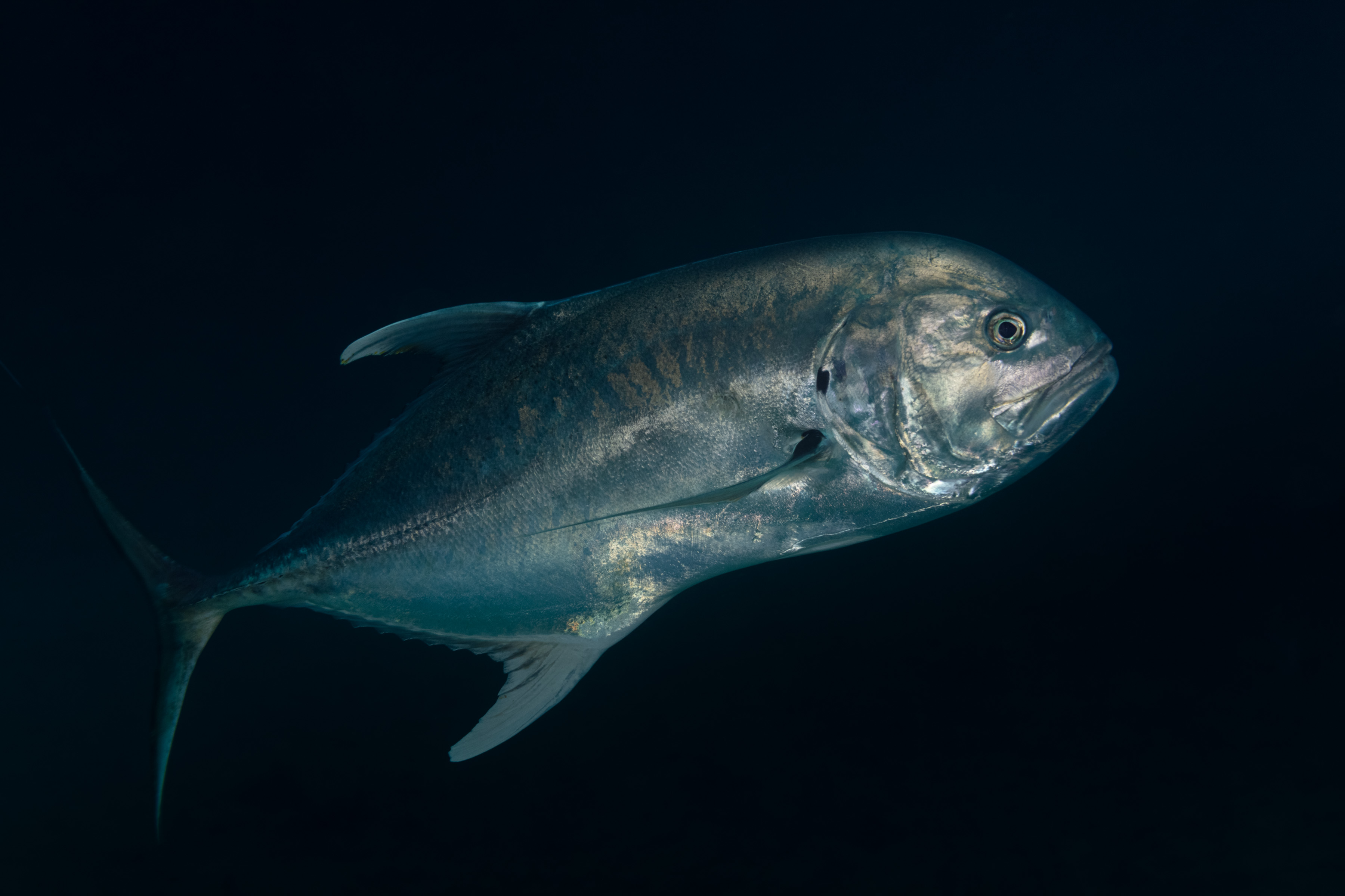 The Crevalle Jack has a silvery body with a distinct black spot near the back of its head and another below the pectoral fin. It has a deeply forked tail, and both its tail and fins are often pale yellow. The upper tail and the tips of the dorsal fins sometimes appear dark.
