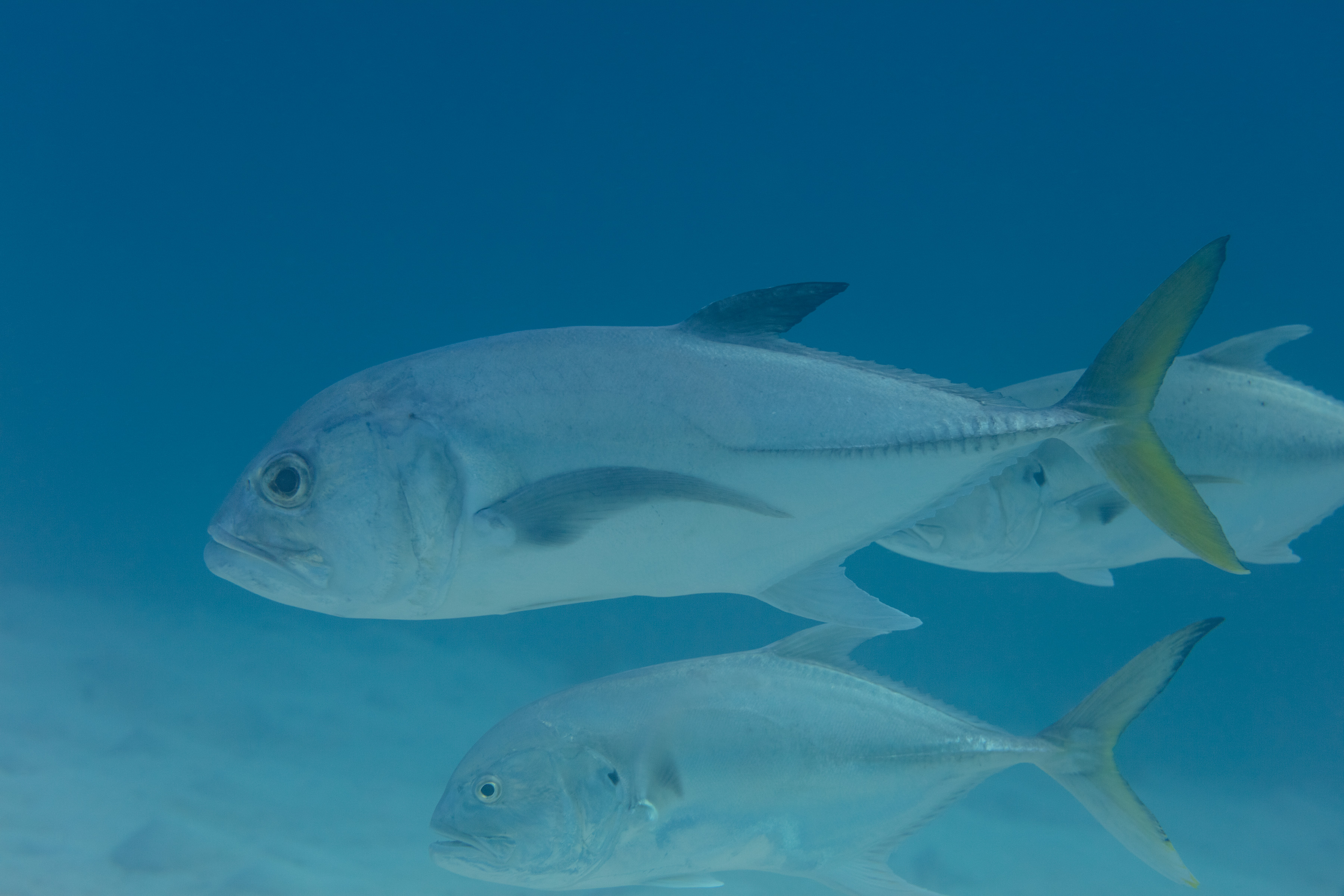 This Jack can be seen in large schools in open water, around wrecks, or in small groups in shallow sandy areas. They primarily hunt smaller fish, shrimp, and other invertebrates. Juveniles often stay in sheltered coastal areas where they can find food and protection. Although generally cautious, they sometimes come near, drawn by exhaled bubbles.