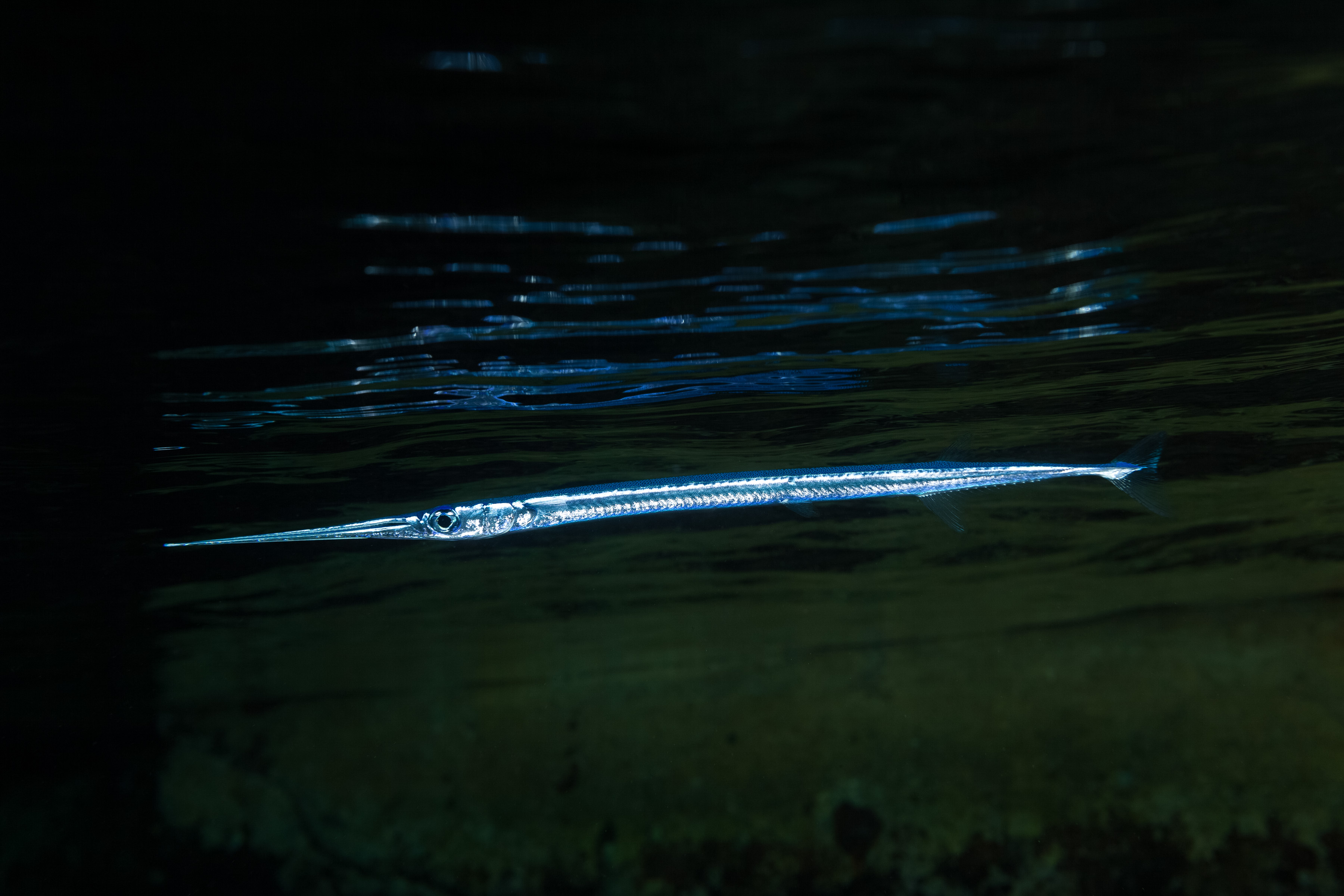 This Needlefish can be found in small groups drifting near the surface over shallow areas and moves away when approached. It uses its long beak to hunt smaller creatures, primarily eating small fish and crustaceans. When threatened or hunting, it may leap out of the water.
