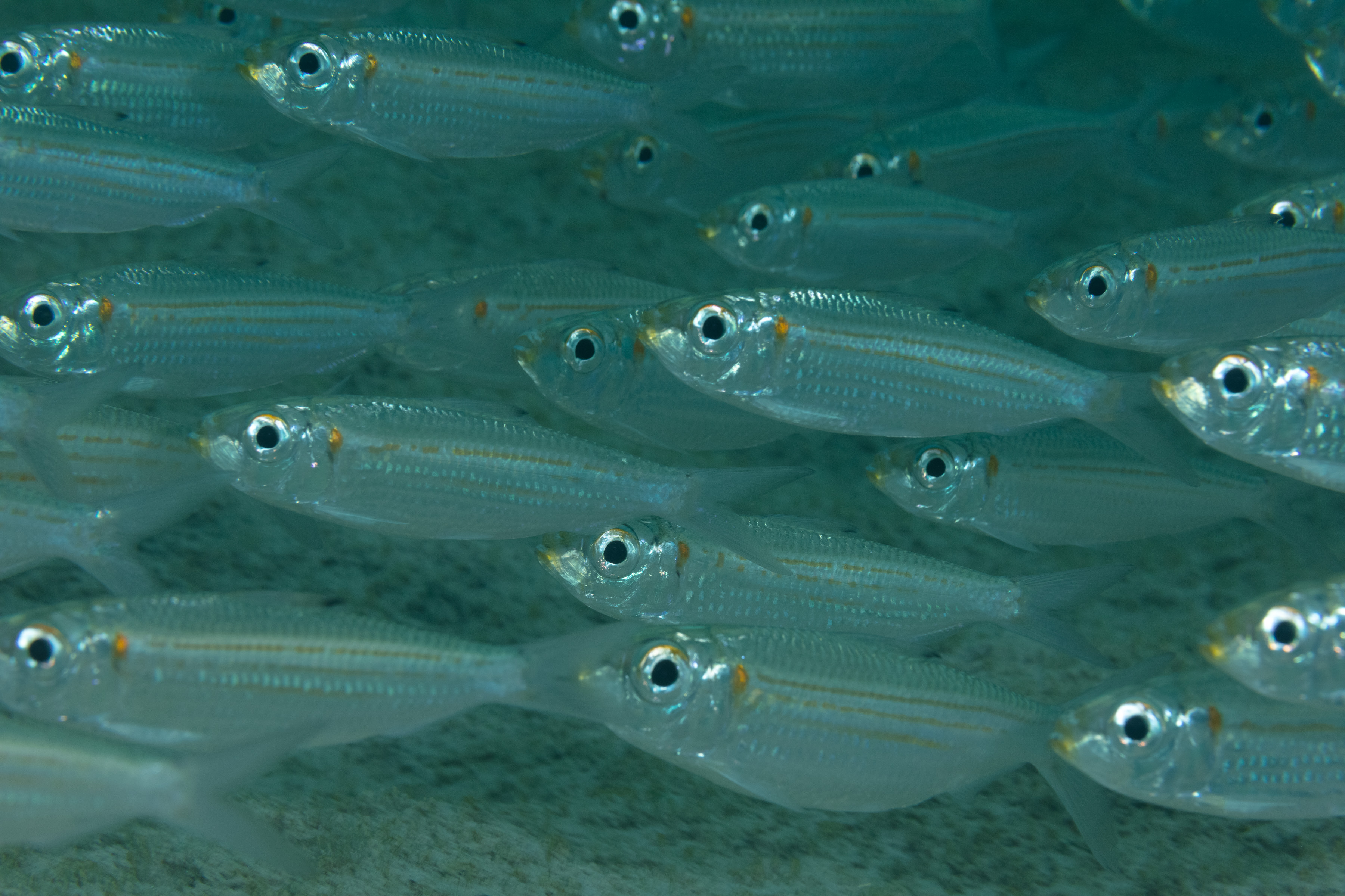 The Redear Herring often swims in large, tight schools (also called bait balls) close to shore, especially over seagrass beds, feeding on tiny floating animals such as small crustaceans. They tend to be cautious and serve as an important food source for many larger predatory fish.