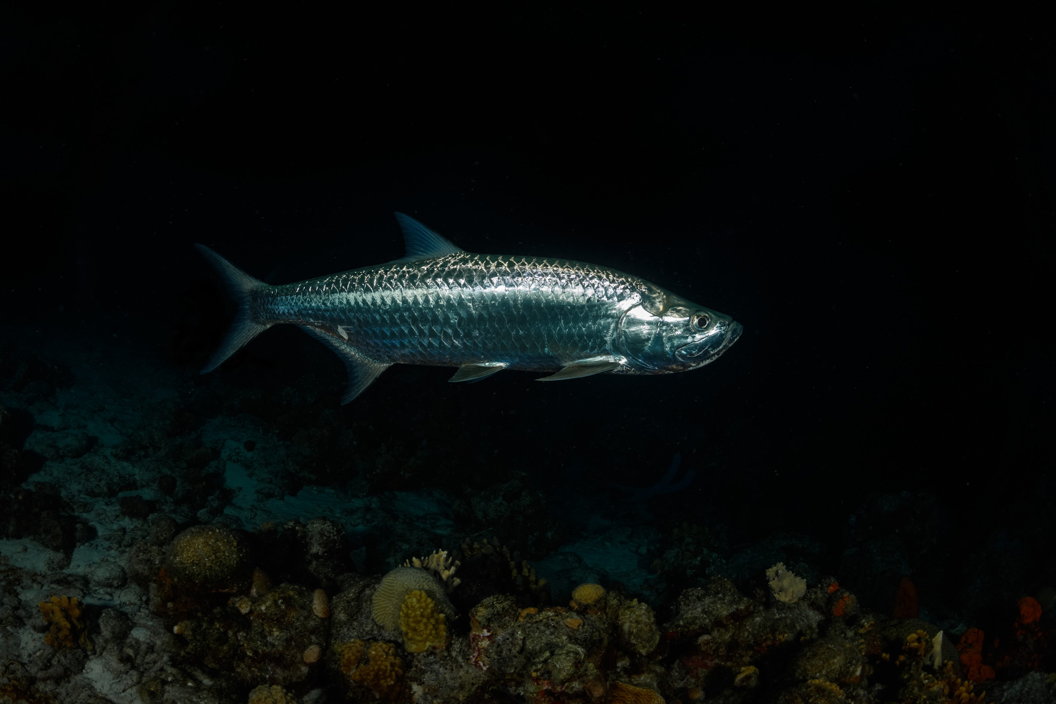 The Tarpon is often found drifting undisturbed above the reef, sometimes schooling during the day in shallow sandy areas or under piers and around wrecks. It actively feeds at night and may follow divers, using their lights to locate prey. Some individuals stay in the same area for years, making them a familiar sight in certain locations.