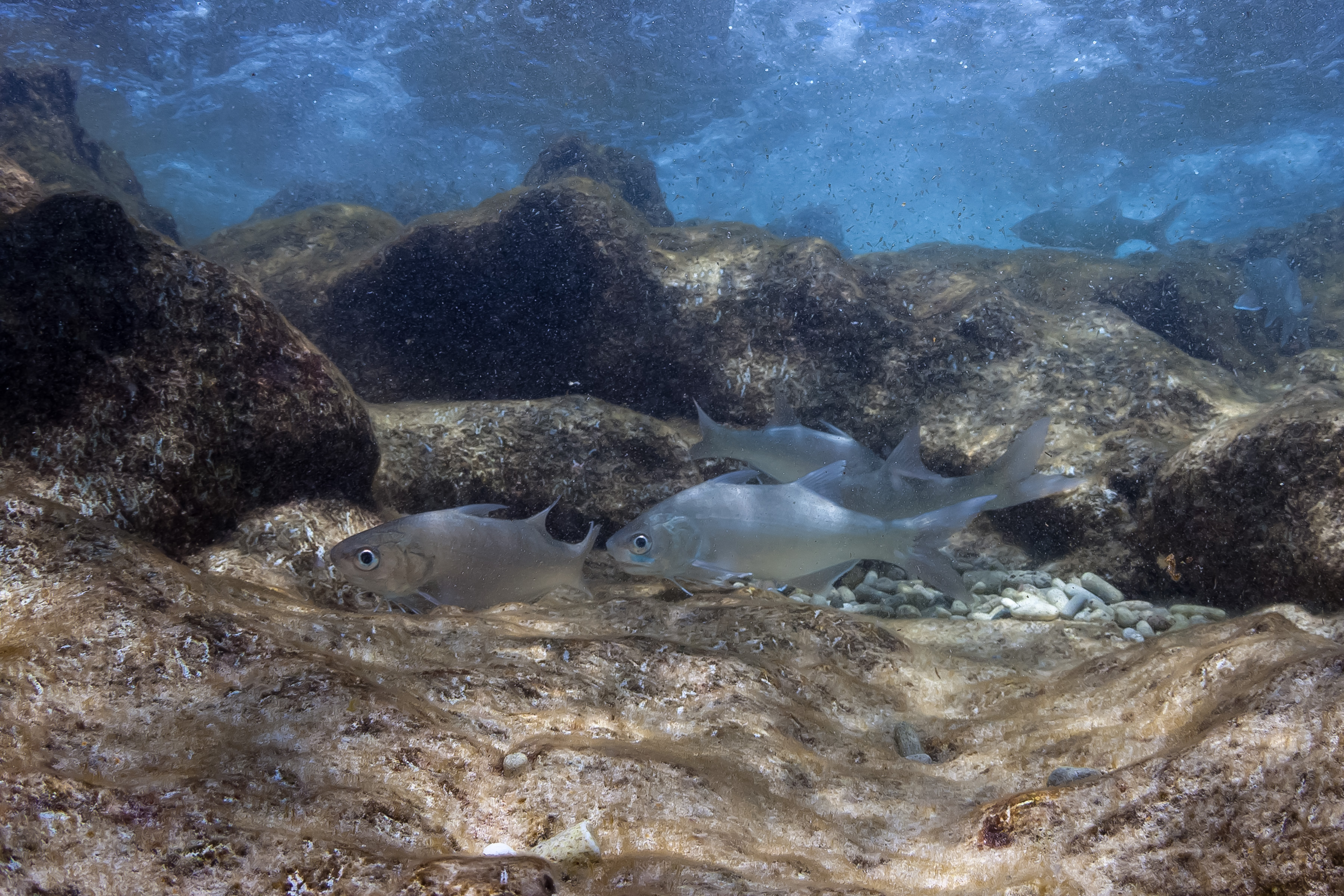 Threadfins can be seen in the shallows near sandy beaches. They often move in groups and use their long fin rays to search the bottom for food. Threadfins are hard to identify visually. On Bonaire, these could be Littlescale Threadfin or, less likely, Barbu Threadfin.