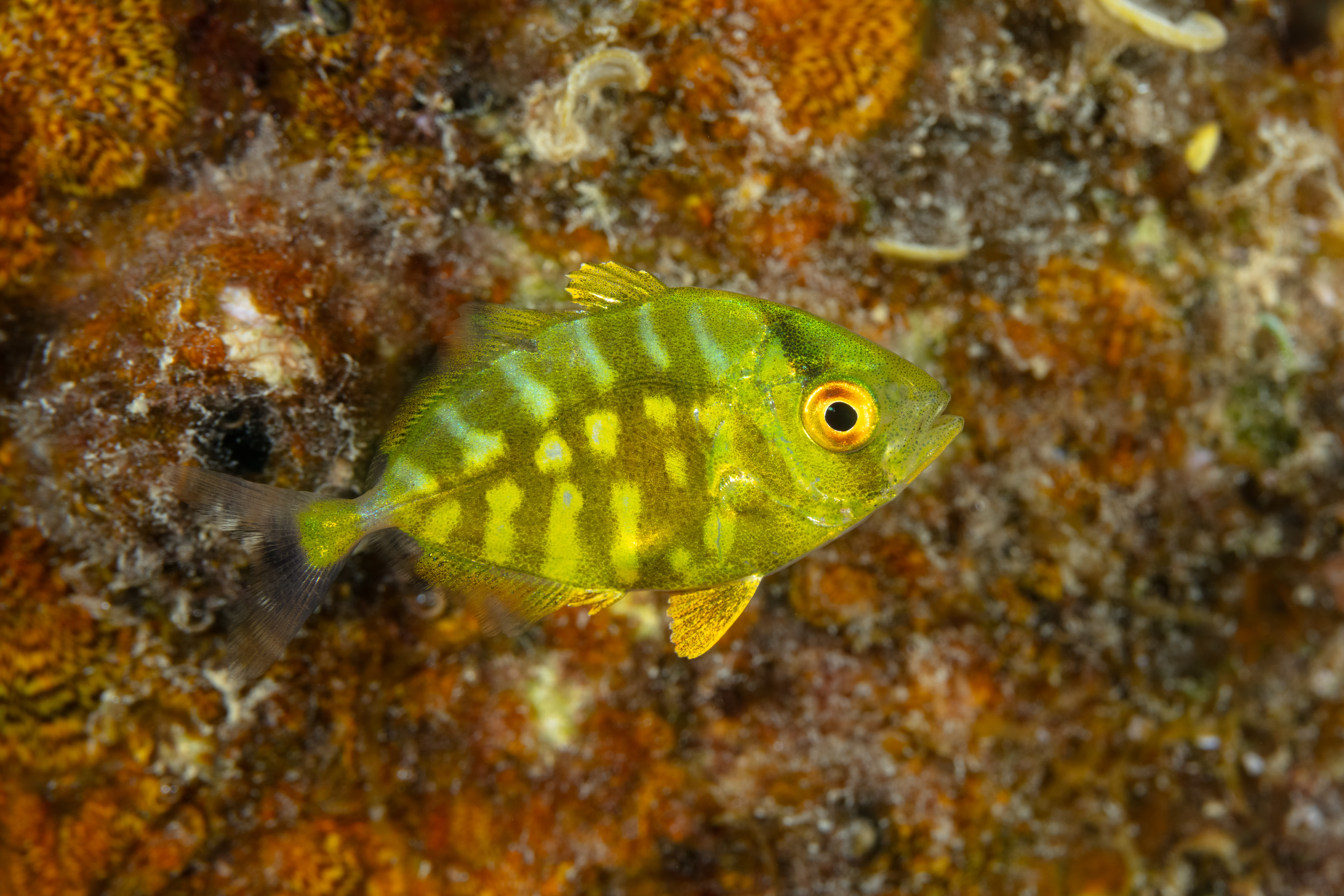 The Yellow Jack has an elongated, silvery-yellow, sleek body, and its fins and tail are bright yellow. The body is often marked with a series of faint, dark blotchy patterns, and a dark stripe runs horizontally through its eye, which is more prominent on juveniles. A similar dark stripe may appear along its back, though it is often more subtle. It can rapidly change its color from silvery with subtle blotchy patterns to a more intense yellow with clearer markings.