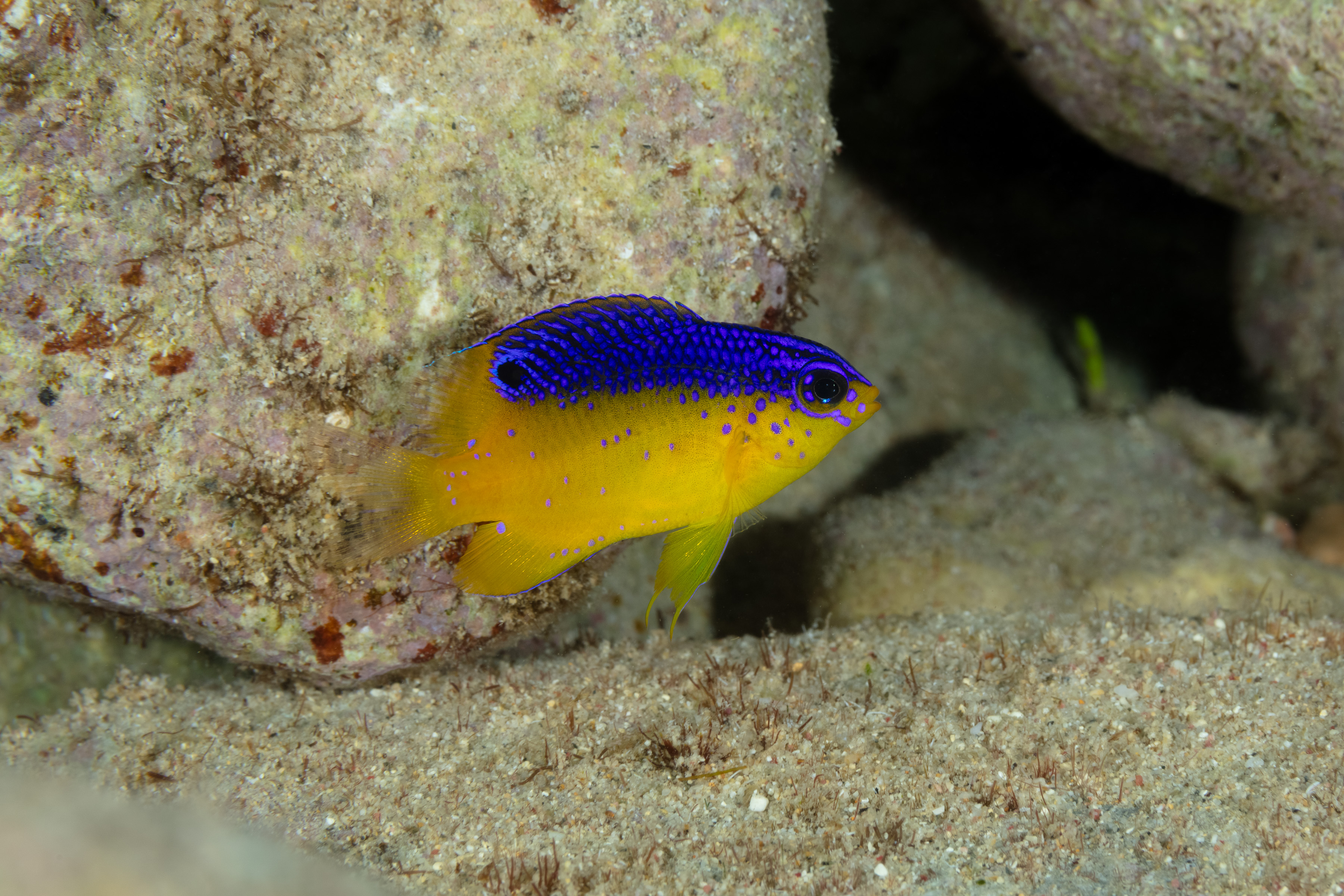 This Damselfish is territorial, but it is not as aggressive as some of its relatives. The male is responsible for guarding and caring for the eggs, which are laid in a nest under a rock or shell by one or more females. He fans the eggs to keep them oxygenated and protects them from predators. Its diet includes small invertebrates such as marine worms, as well as algae.