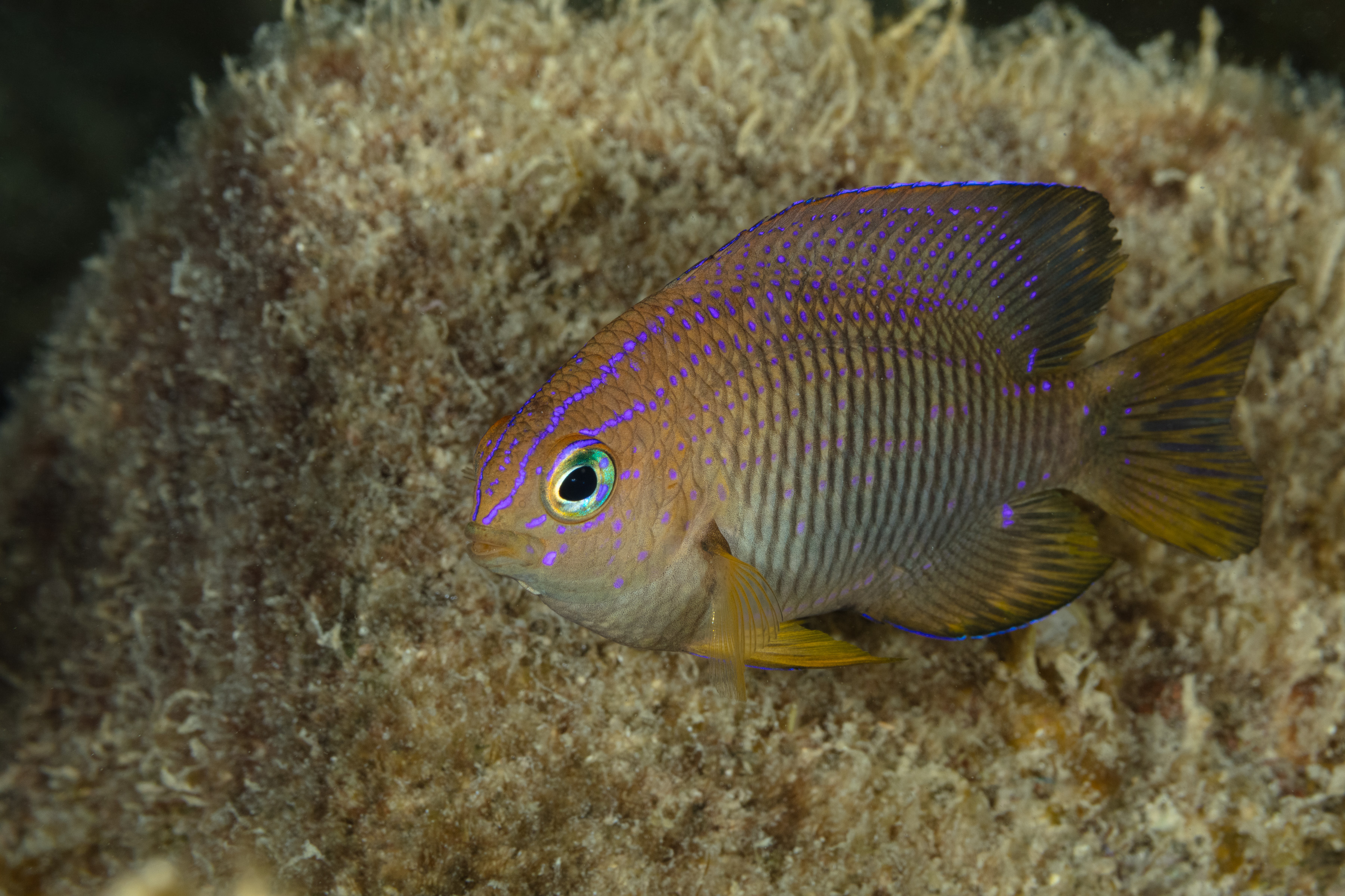 This Damselfish is territorial, but it is not as aggressive as some of its relatives. The male is responsible for guarding and caring for the eggs, which are laid in a nest under a rock or shell by one or more females. He fans the eggs to keep them oxygenated and protects them from predators. Its diet includes small invertebrates such as marine worms, as well as algae.