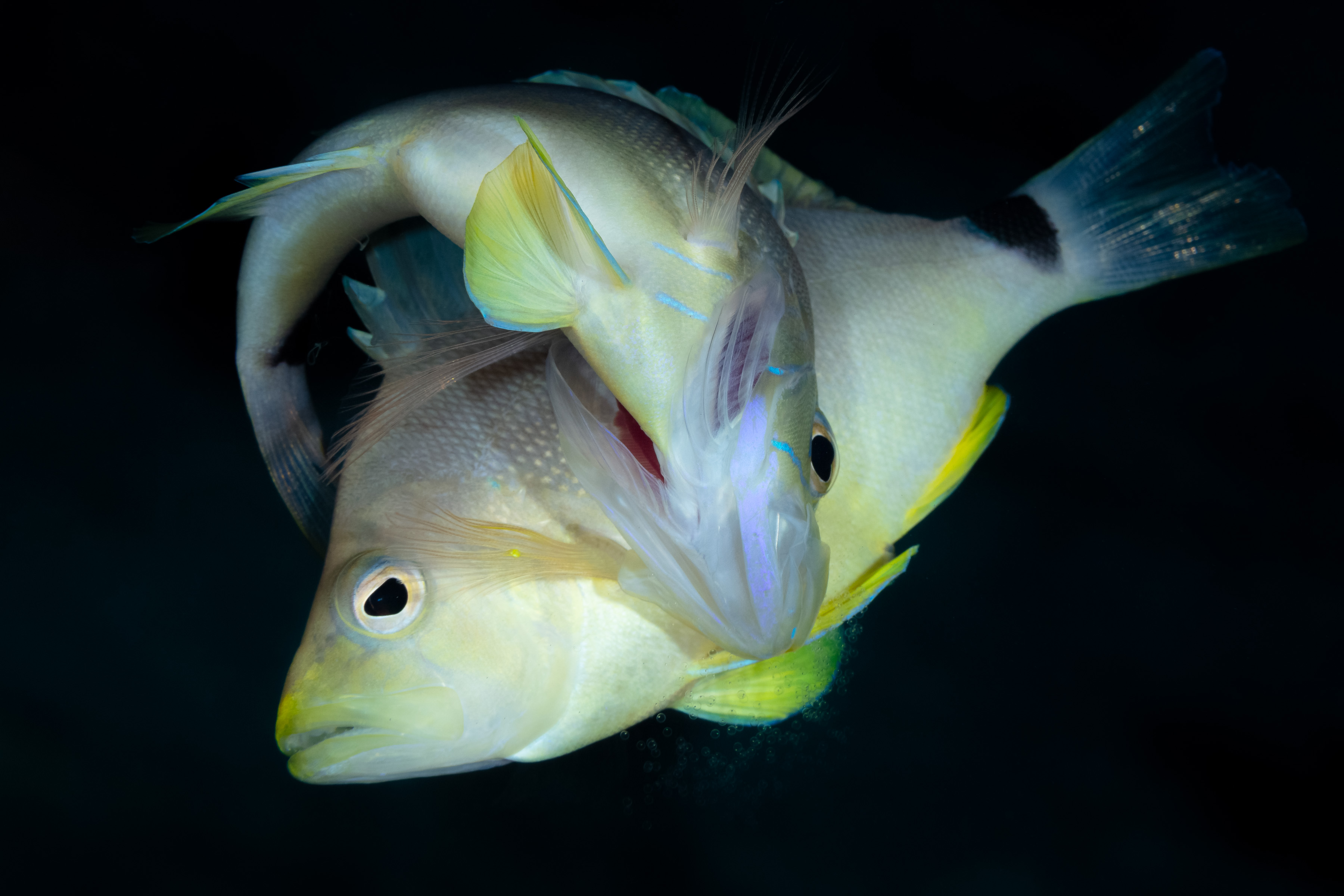 Hamlets have a unique way of mating. They don't have separate males and females. Every evening at sunset, they meet with the same partner in the same area. As it gets darker, they take turns being the "male" or "female" in a behavior called egg trading. One starts by flaring its fins and shaking its head, while the other embraces it and swims upward to release eggs. Then they switch roles and repeat the process.