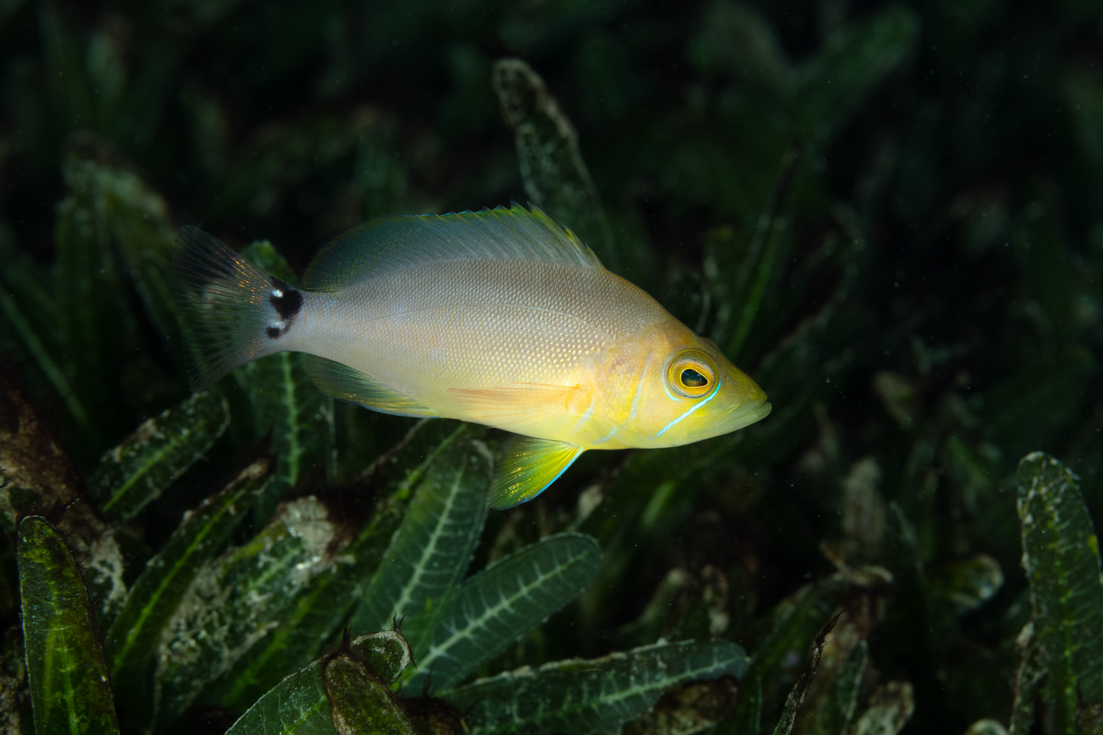 The Butter Hamlet has a body that ranges from light gray to yellow. Its head is marked with blue lines, and it sometimes has a black spot on its snout. It also has a large black blotch on the upper part of its tail base.