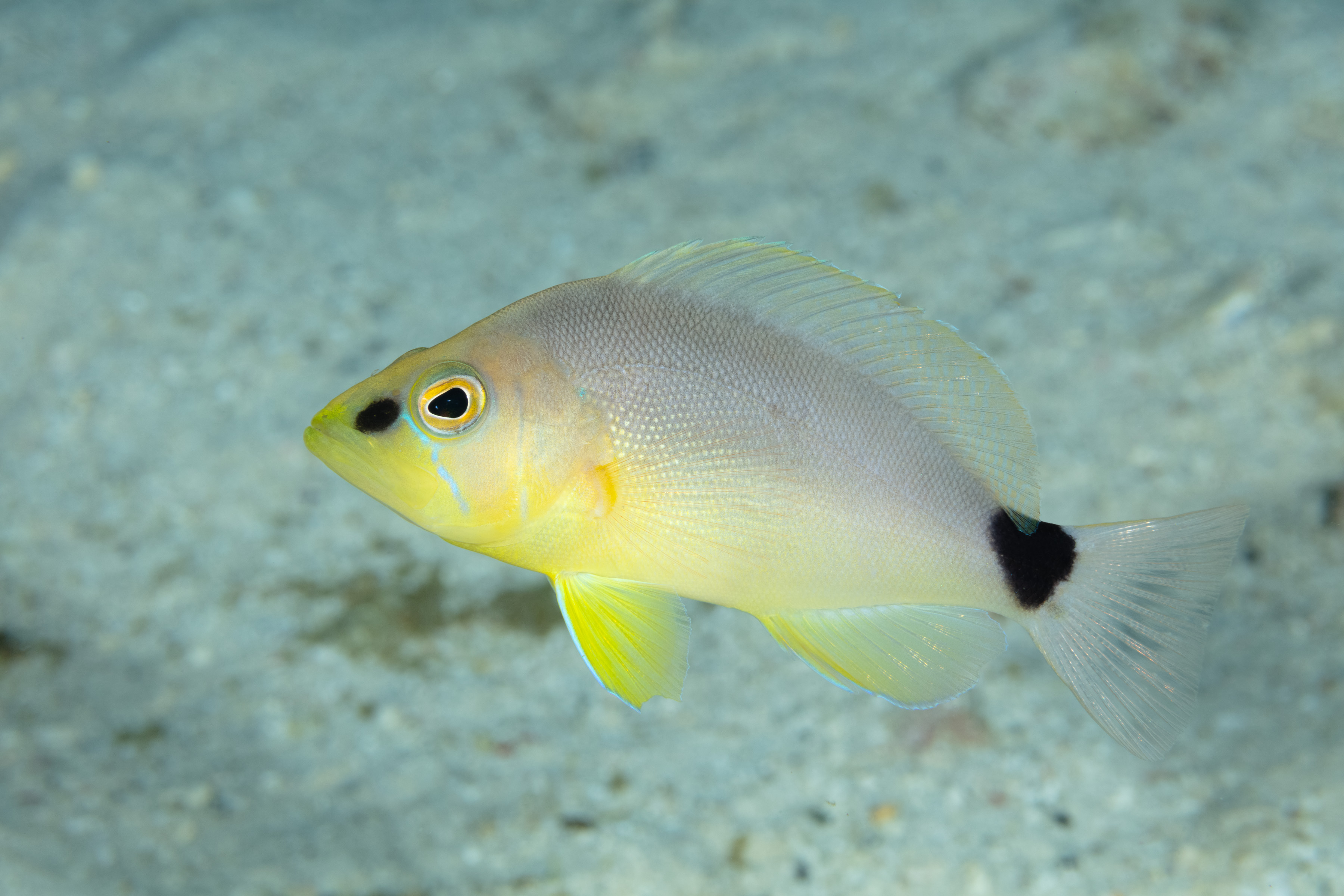 The Butter Hamlet has a body that ranges from light gray to yellow. Its head is marked with blue lines, and it sometimes has a black spot on its snout. It also has a large black blotch on the upper part of its tail base.
