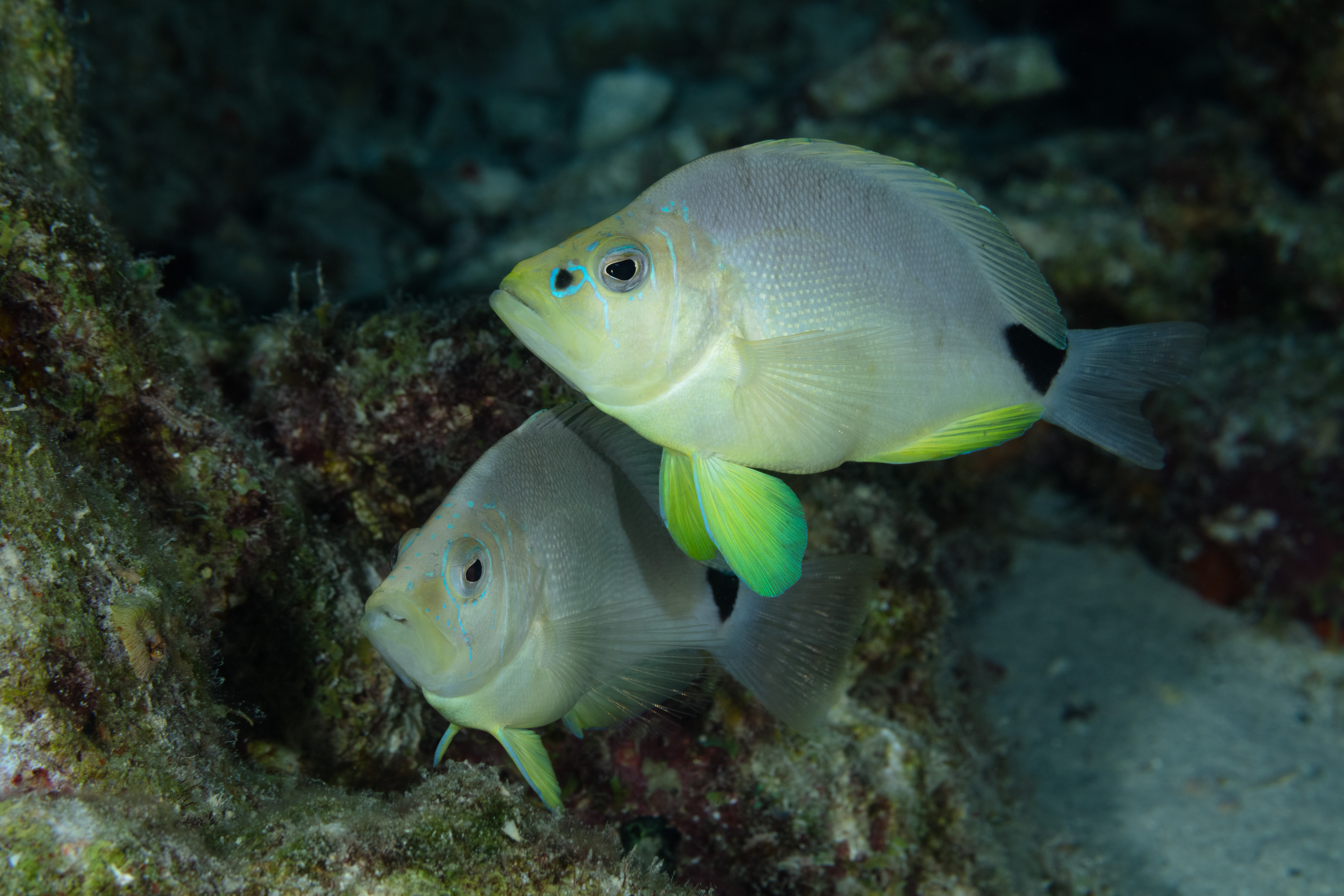 The Butter Hamlet has a body that ranges from light gray to yellow. Its head is marked with blue lines, and it sometimes has a black spot on its snout. It also has a large black blotch on the upper part of its tail base.