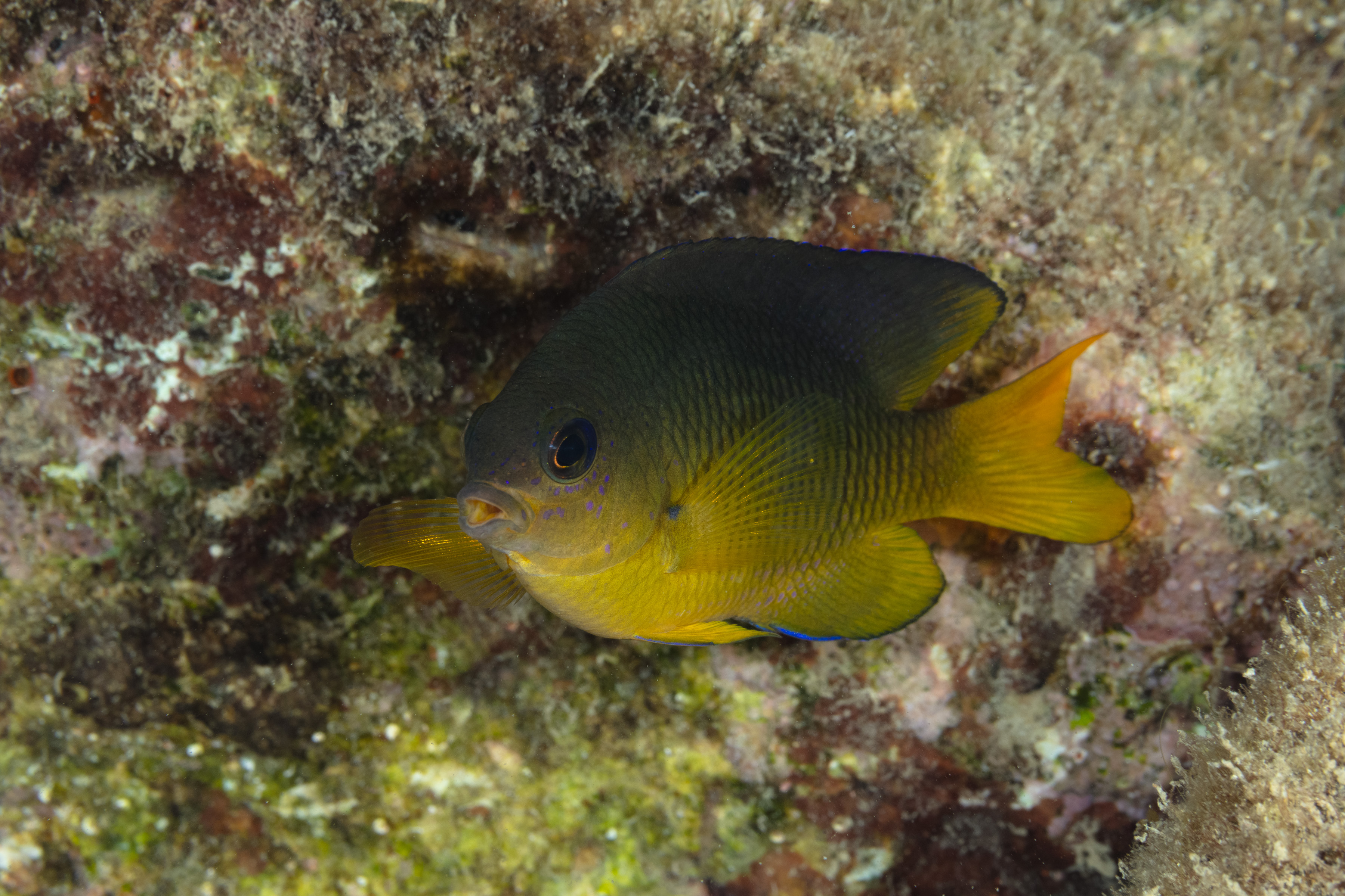 This Damselfish lives around coral structures, especially along the front sections where Hard Corals grow. They maintain small territories and may defend them, particularly when males are guarding eggs.