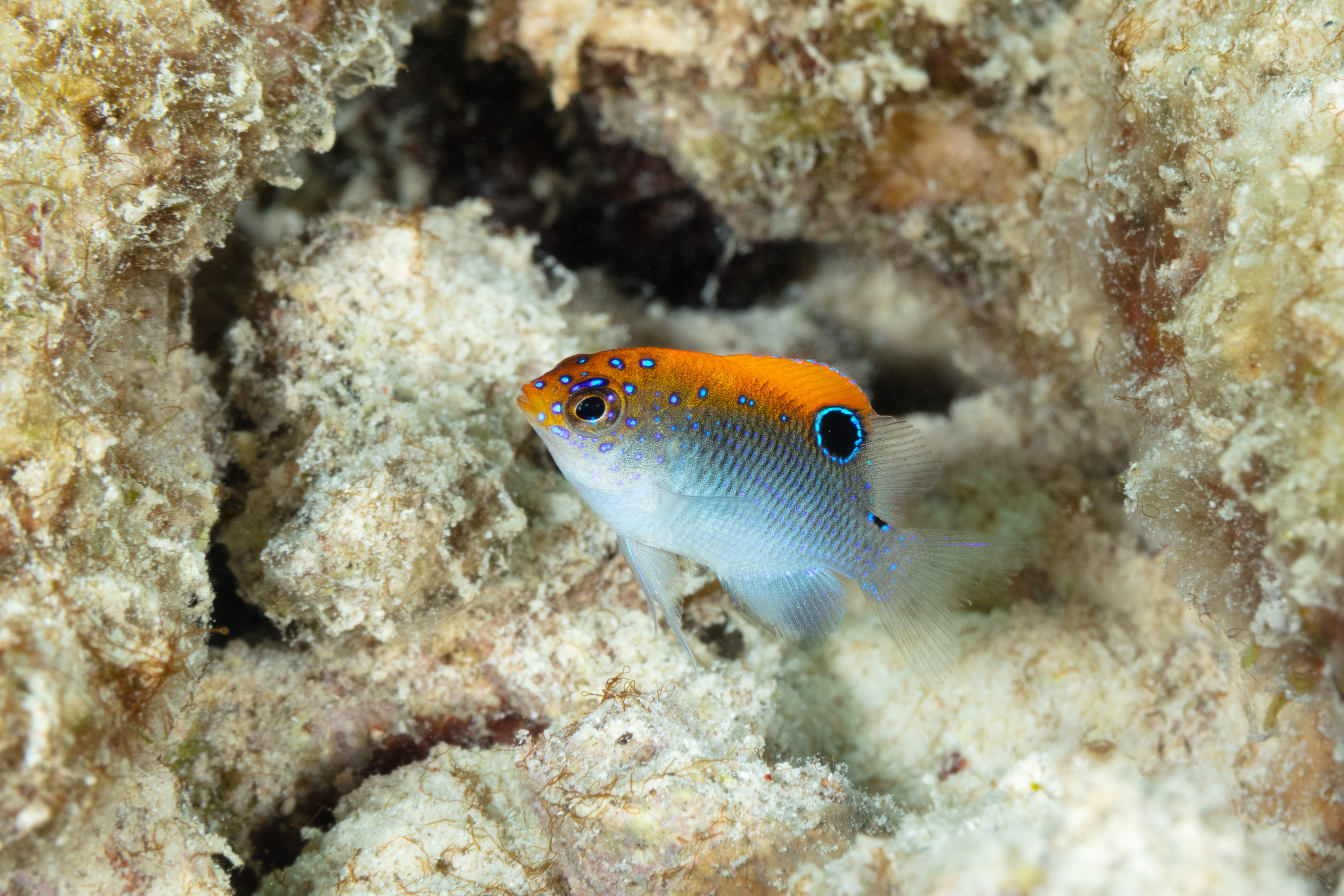 This Damselfish is known for its territorial behavior and is often found in shallow, rocky areas. It feeds mostly on algae and other plant matter from its territory. The female lays sticky eggs on clean rock surfaces after pairing. The male guards the eggs, keeping them clean and fanning them with his fins to provide oxygen until they hatch.