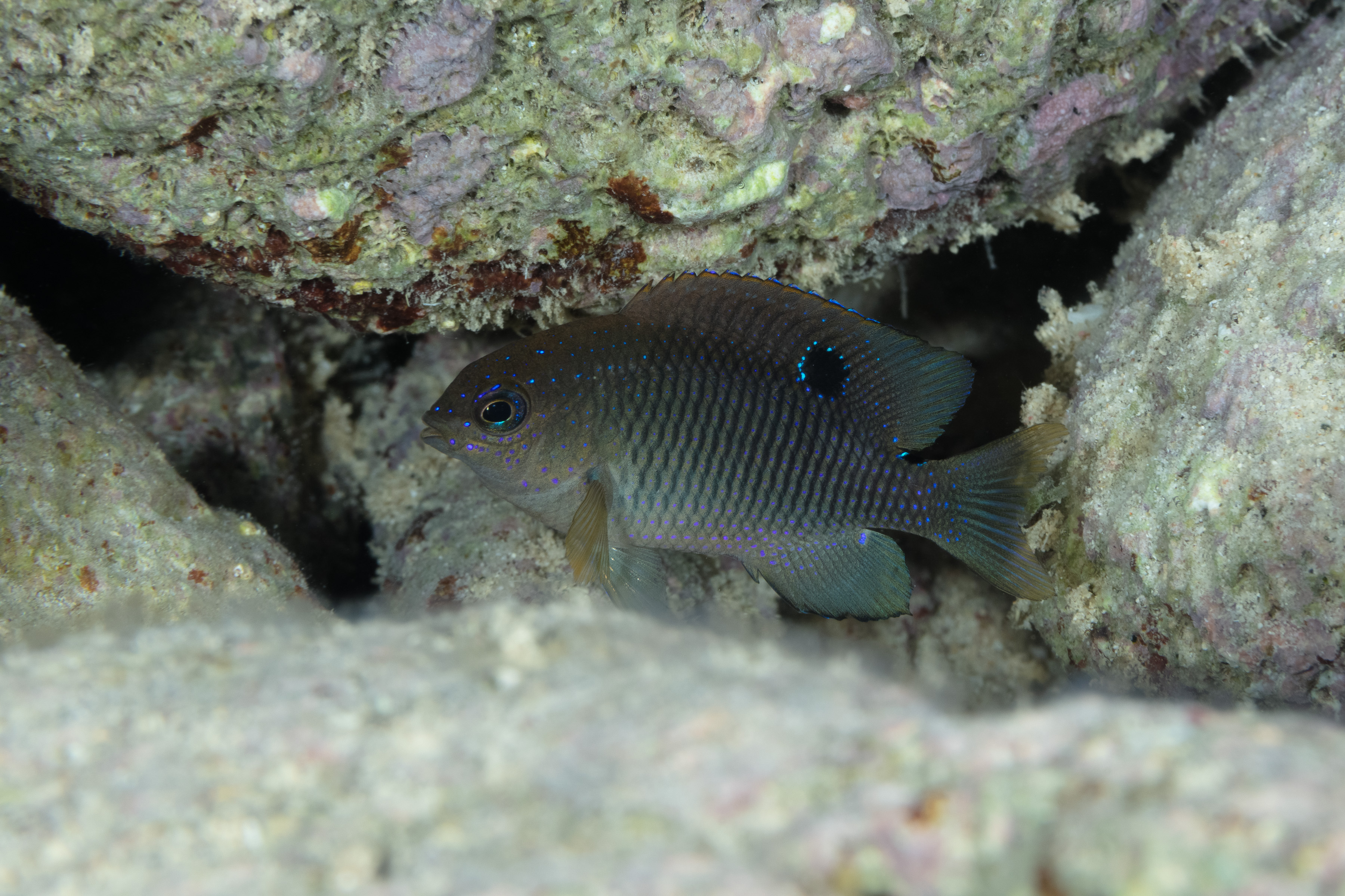 This Damselfish is known for its territorial behavior and is often found in shallow, rocky areas. It feeds mostly on algae and other plant matter from its territory. The female lays sticky eggs on clean rock surfaces after pairing. The male guards the eggs, keeping them clean and fanning them with his fins to provide oxygen until they hatch.
