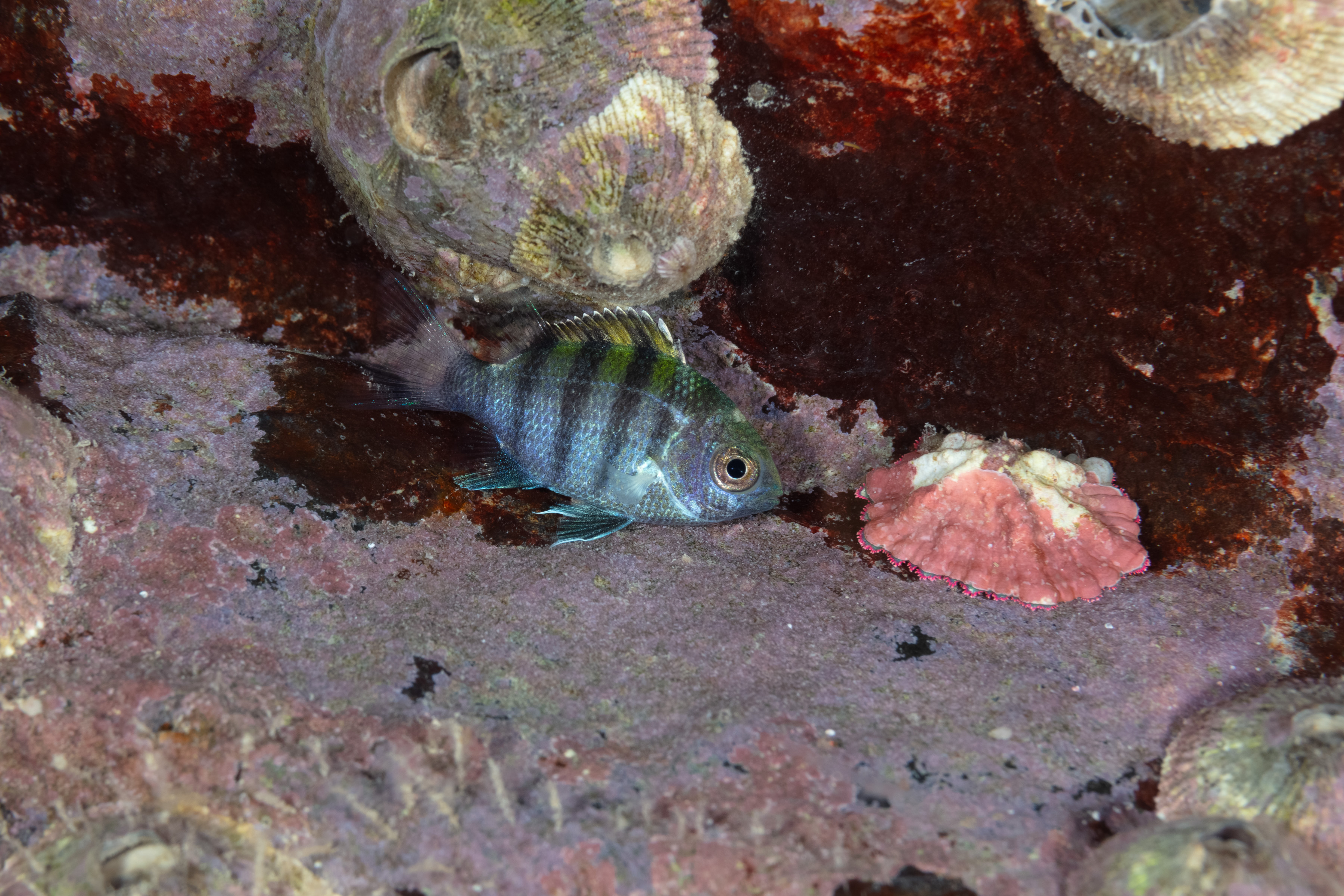 The Sergeant Major is often seen in large groups swimming above the reef. It eats algae, small crustaceans, and plankton. During breeding, males become very territorial, preparing a nest on a hard surface and fiercely protecting the eggs laid by females until they hatch. Juveniles also act as cleaners, removing parasites, algae, and dead skin from other marine animals, including large Green Sea Turtles.