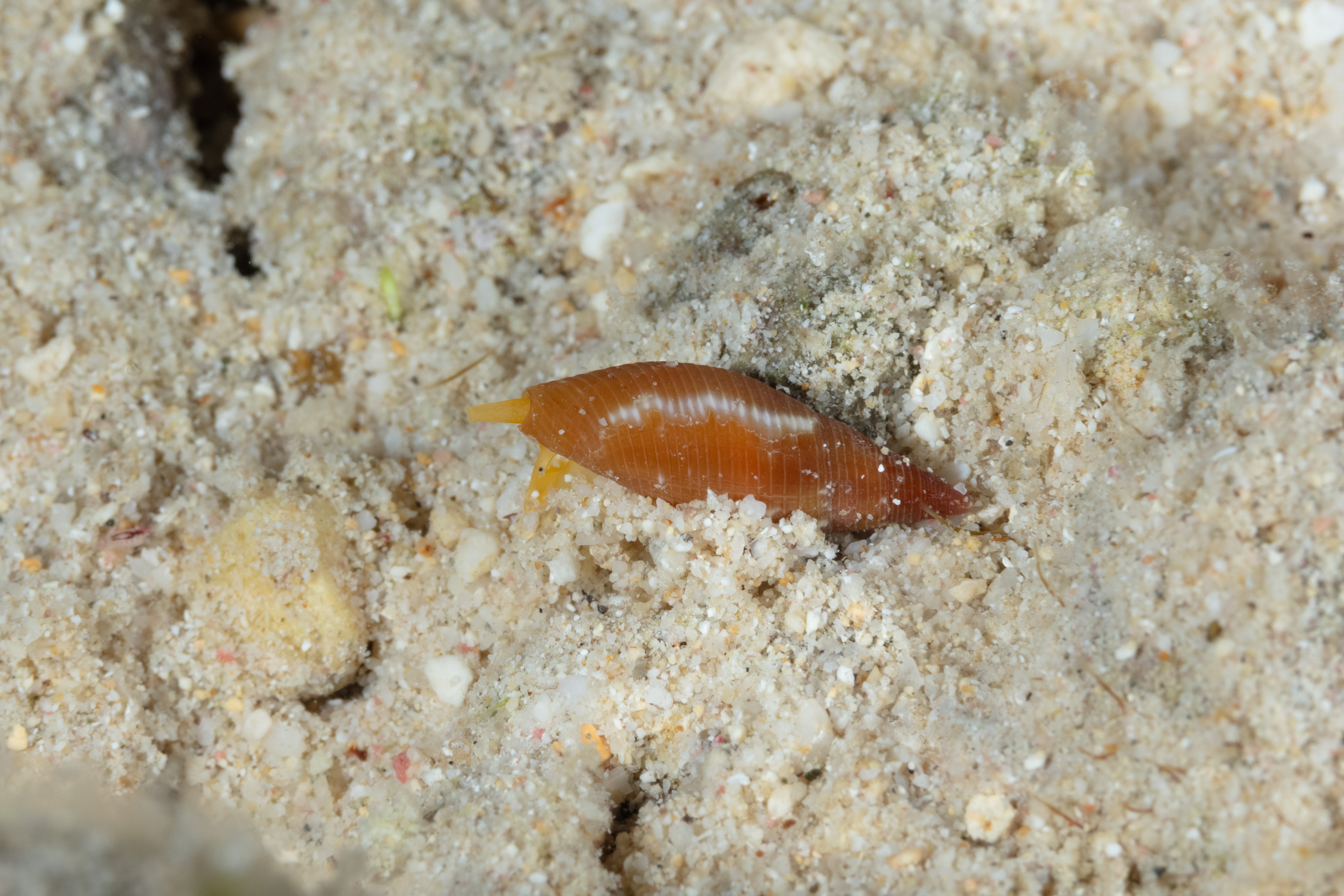 This Snail has an elongated shell with a long, thin spire. Its shell is dark brown to reddish, and it has a yellow mantle.