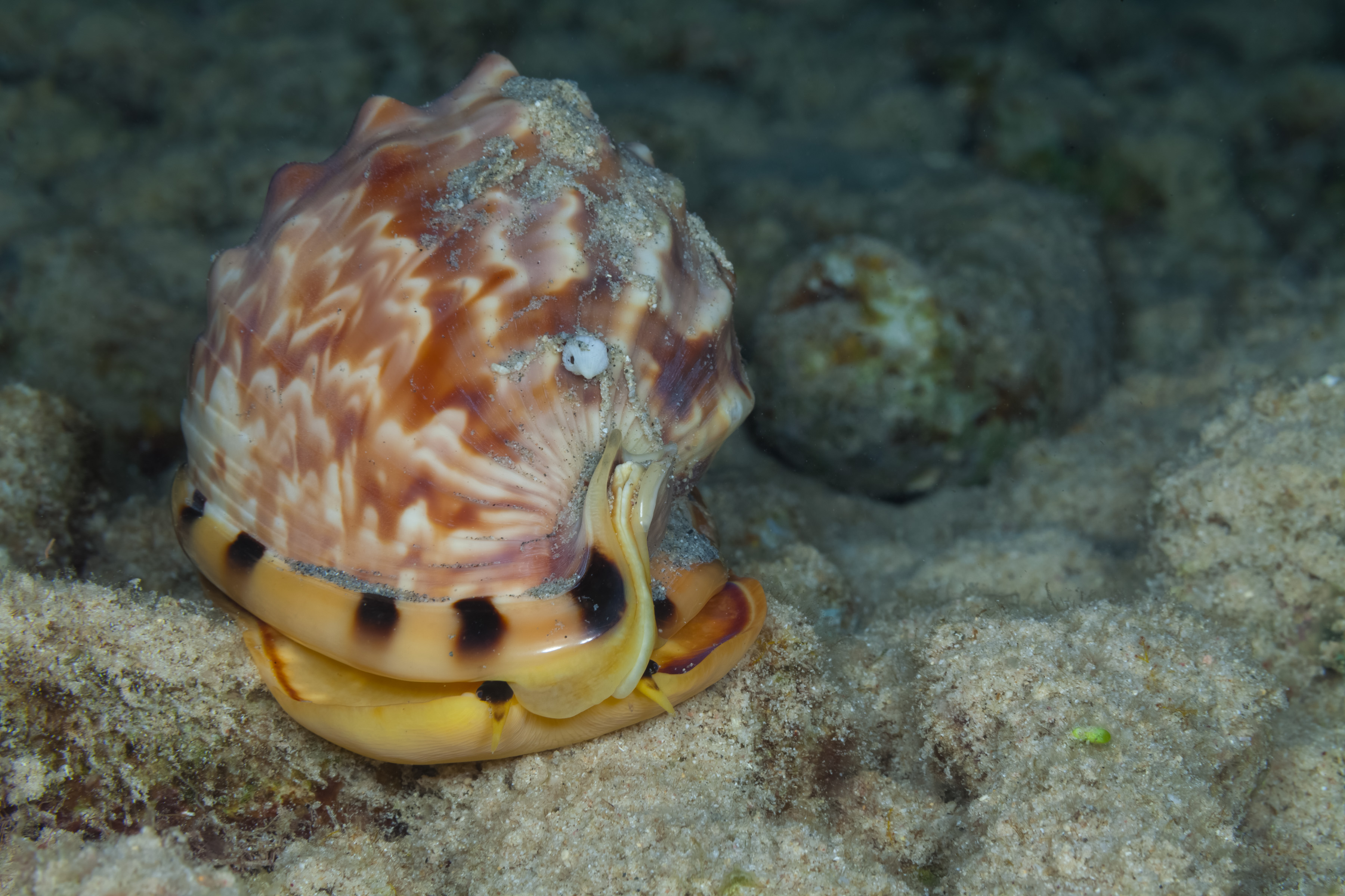 The Flame Helmet is usually found alone on sandy seafloors or in seagrass beds in shallow water. It is an active hunter at night, feeding mainly on Sea Urchins. It can use toxic saliva to immobilize its prey.