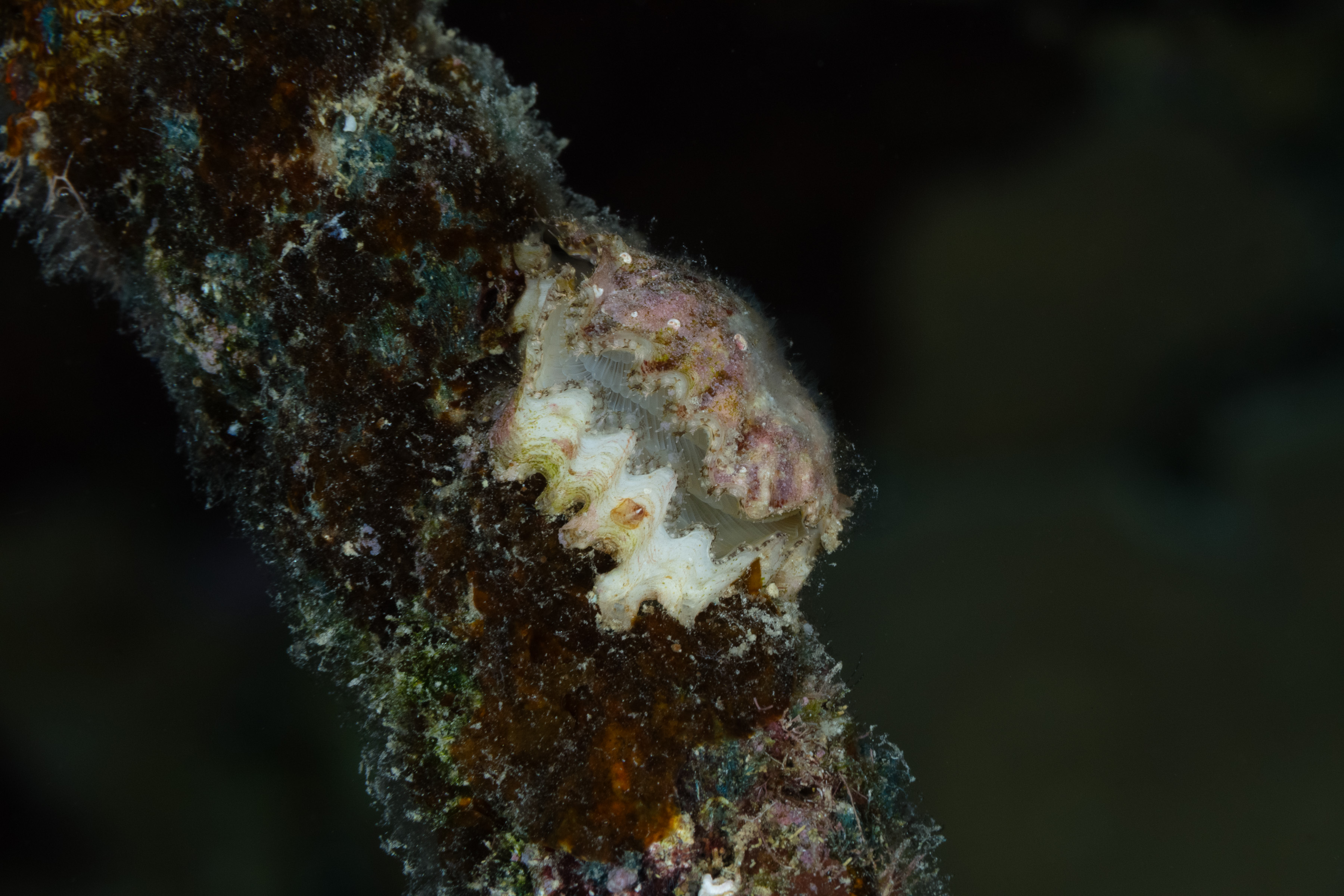 This Oyster lives attached to hard surfaces such as rocks, dead Coral, and Gorgonians. Once an individual settles, it does not move again. As a filter feeder, it draws water through its shell and filters out Plankton and other tiny organic particles. Its shell provides a stable surface for other organisms, like Sponges, Hydroids, and Algae, to grow on.