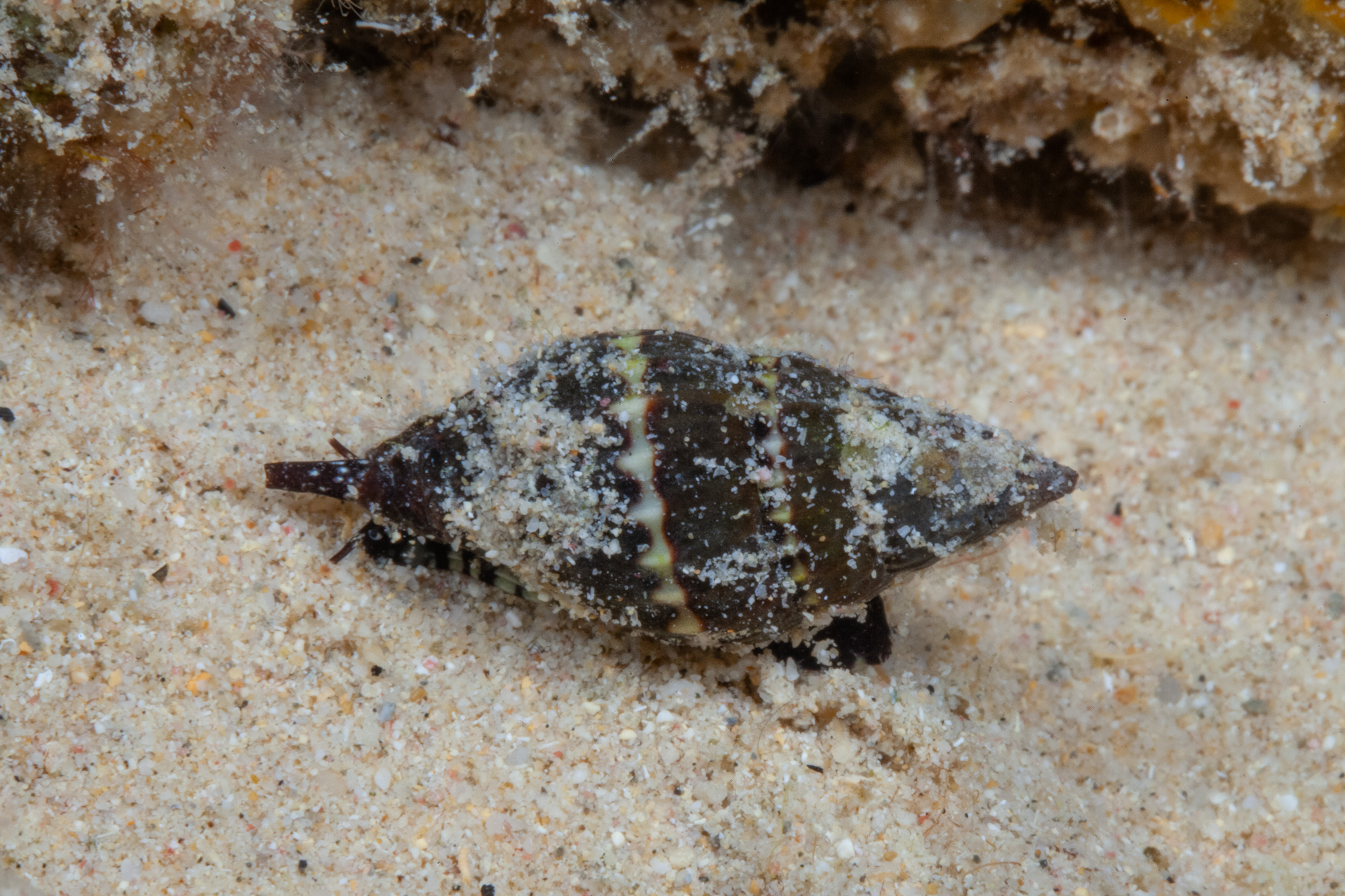 This small snail is also called White-Lined Miter and lives mostly in shallow waters. As a member of the Costellariidae family, this snail is likely a predator that eats small animals. It reproduces by laying eggs that grow into young snails without a free-swimming stage, which is different from many other sea snails.