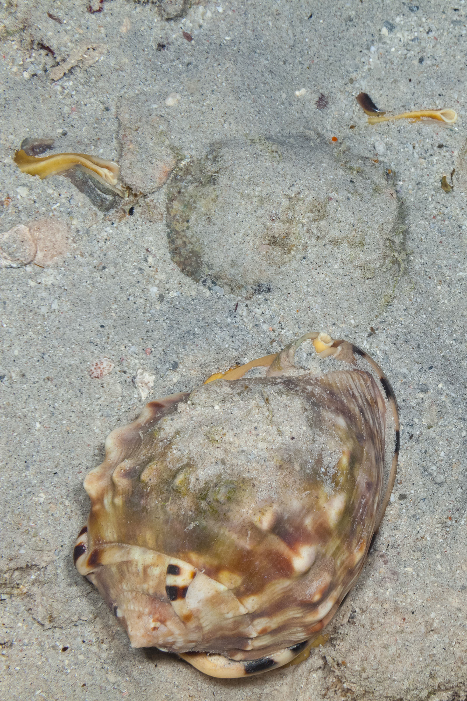 The King Helmet is also known as the Caribbean Helmet and is primarily found alone at night in shallow, sandy areas. It moves along the seafloor in search of prey, mostly Sea Urchins. The snail uses its strong foot to grip the urchin and break spines in a small area, then drills a hole with its radula. Acidic saliva helps weaken or dissolve parts of the urchin’s outer shell. The King Helmet’s large size and solid shell help protect it from predators.