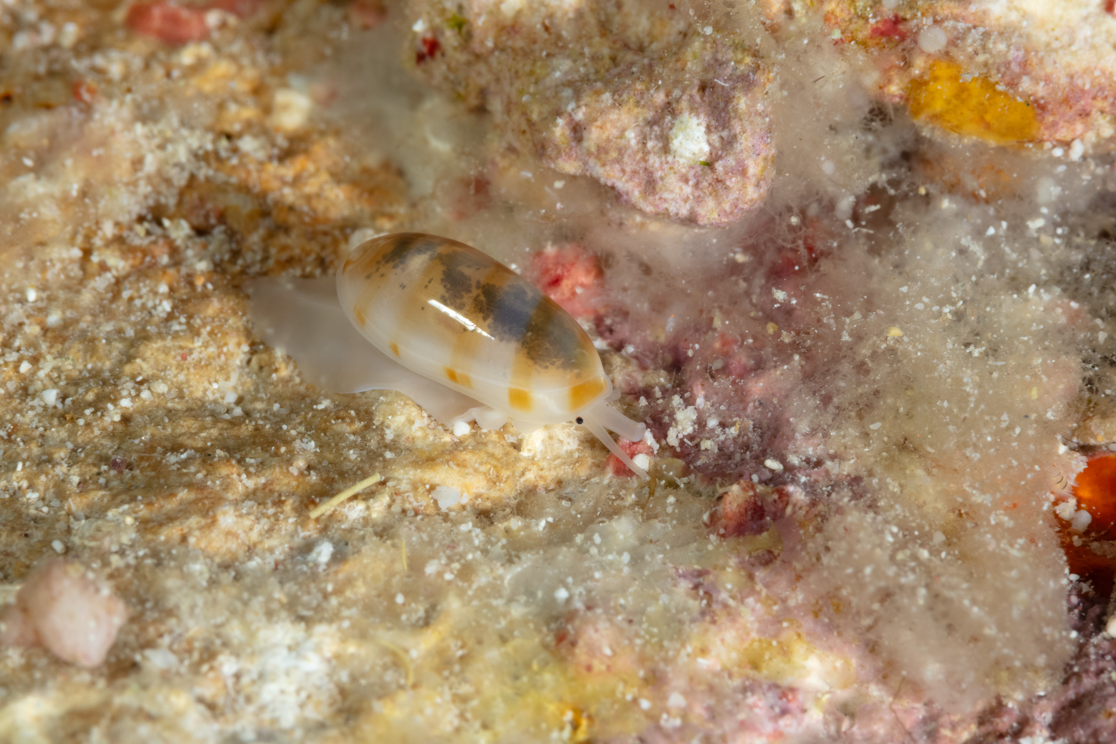 This small Snail has a teardrop-shaped orange shell with narrow white bands. The mantle may be covered with white blotches and orange spots.