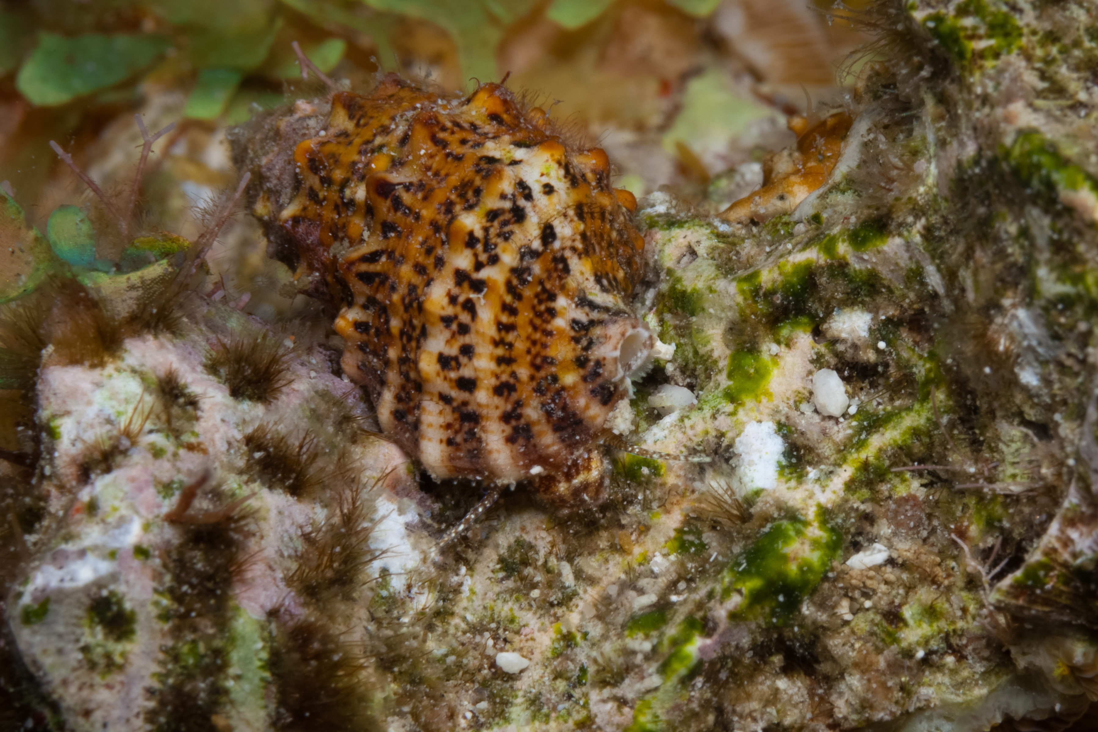 The Stocky Cerith is often seen crawling in large groups over rocks and sand in shallow waters.