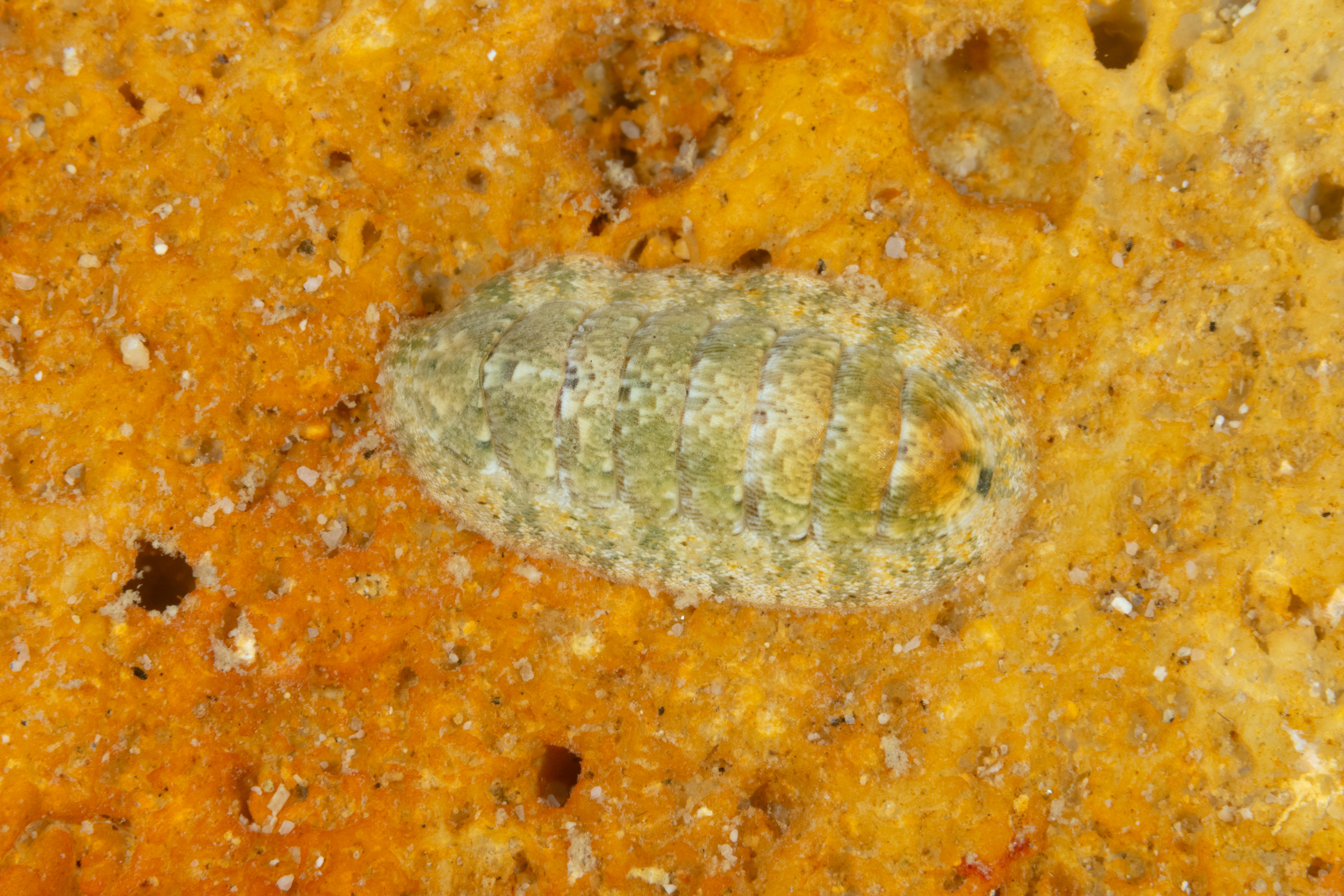 This Chiton is usually found alone on rocks in shallow coastal areas, where it clings tightly to the hard surface. It is often overlooked because of its small size and ability to blend in with its surroundings. The chiton feeds at night, scraping algae, microorganisms, and small invertebrates from the rock surface with a special rasping tongue called a radula. When dislodged, it can curl into a ball to protect its soft underside.
