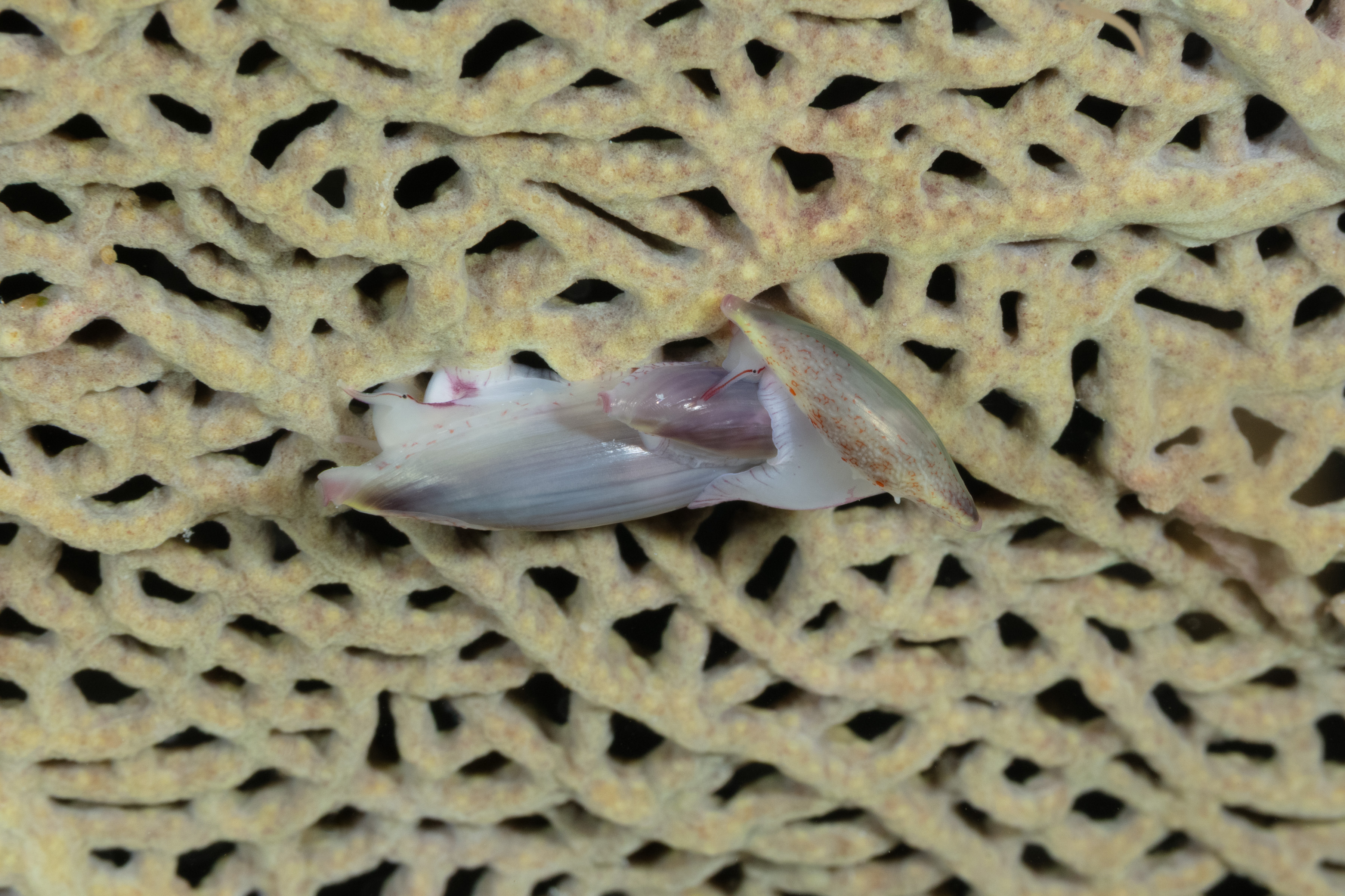 This Simnia has a mantle that is purple, yellow, or green, often purple with small pale spots.