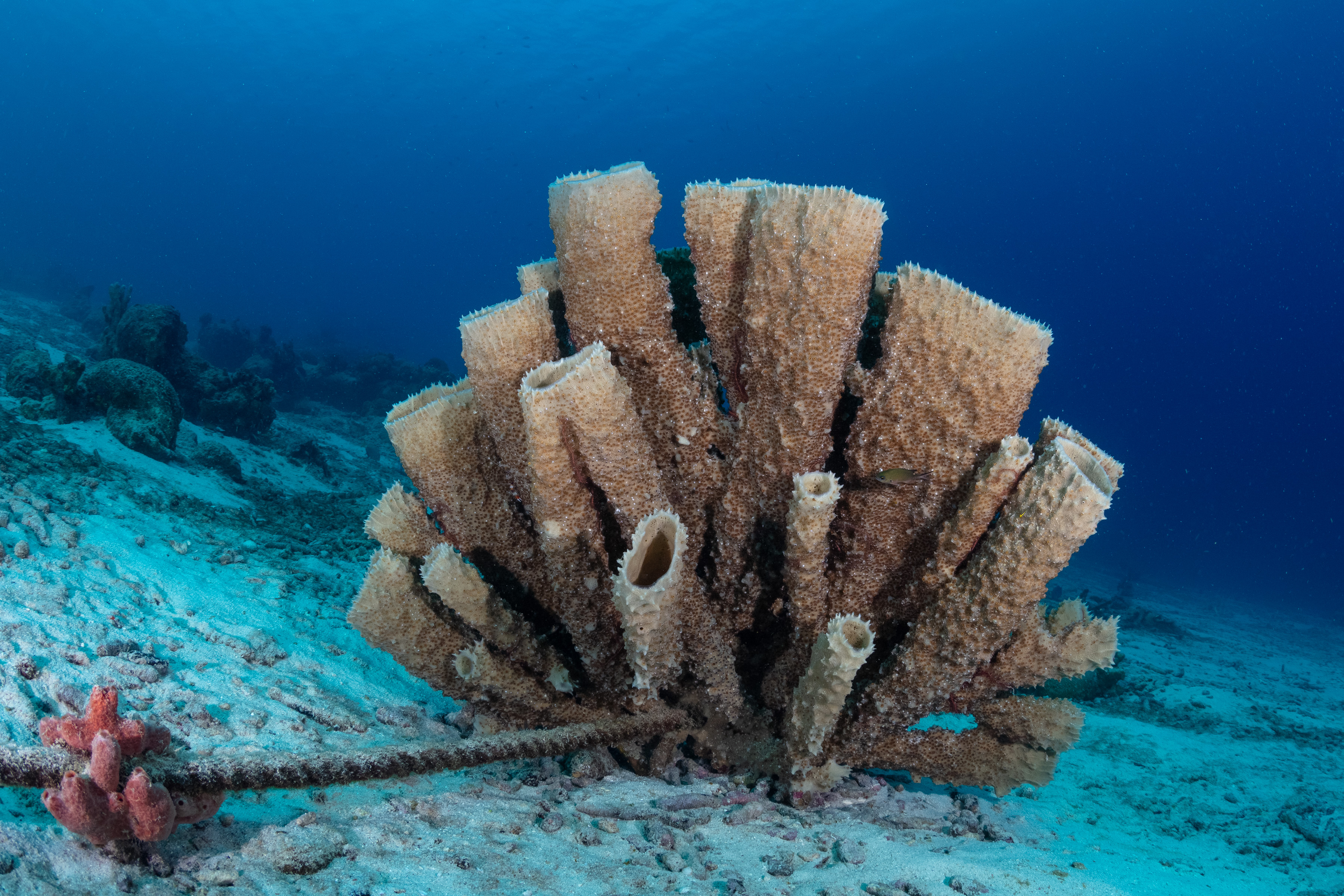 The Branching Vase Sponge often grows in groups in areas with steady water flow. In areas with strong current, the tubes may grow in a wide, fan-like shape. This Sponge often hosts Brittle Stars inside its tubes that come out at night to feed.