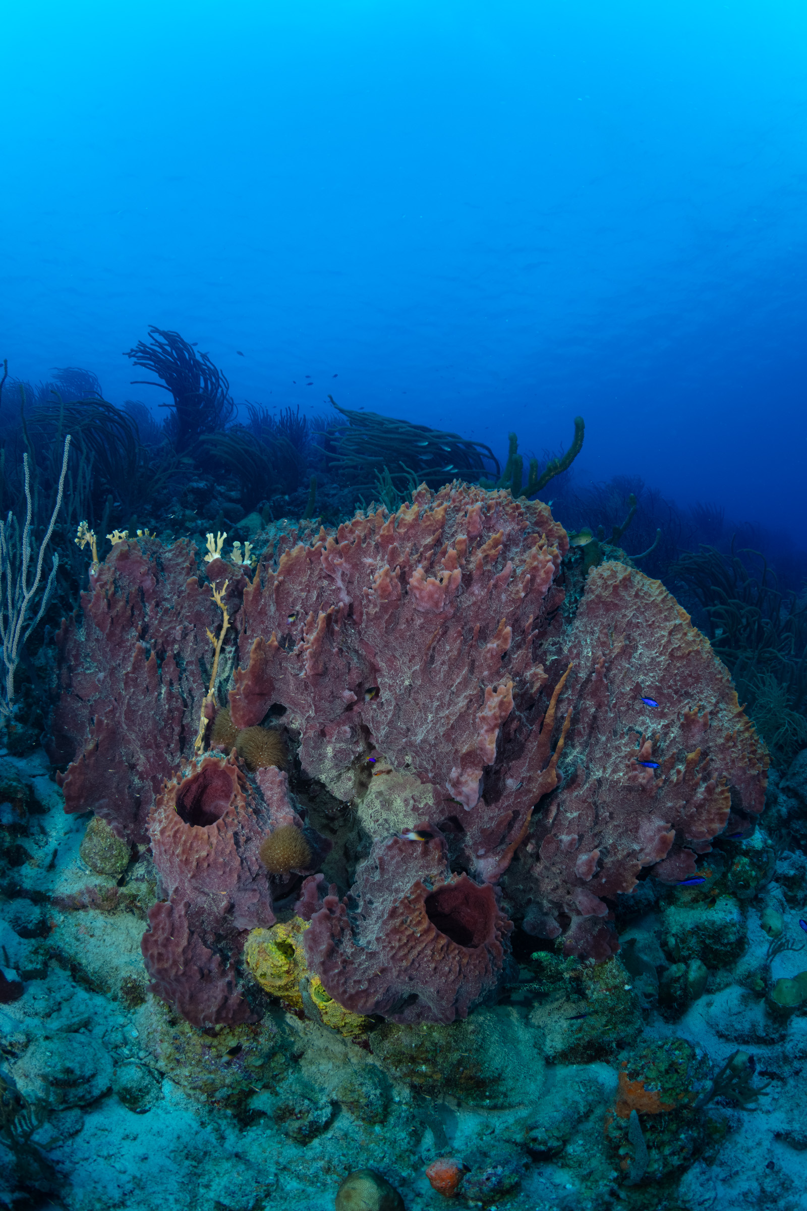 This huge Sponge has a massive, reddish-brown body with jagged rims and a deeply grooved exterior. It typically grows alone, though smaller sponges are often found clustered around its base.