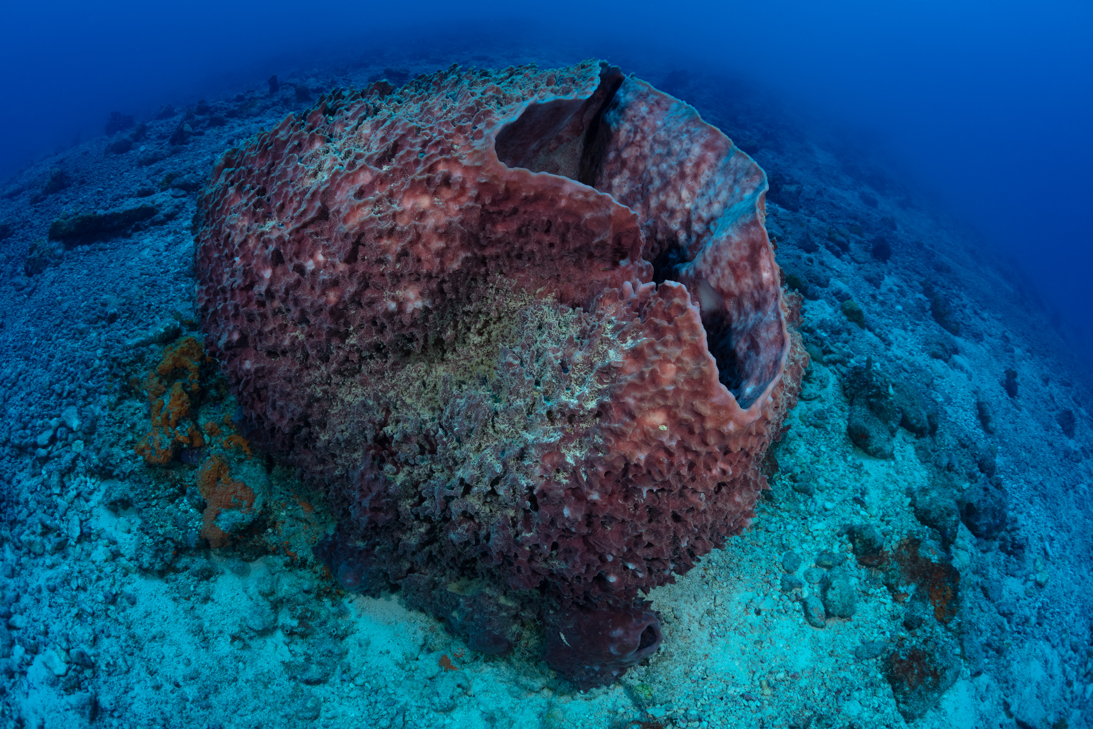 This huge Sponge has a massive, reddish-brown body with jagged rims and a deeply grooved exterior. It typically grows alone, though smaller sponges are often found clustered around its base.