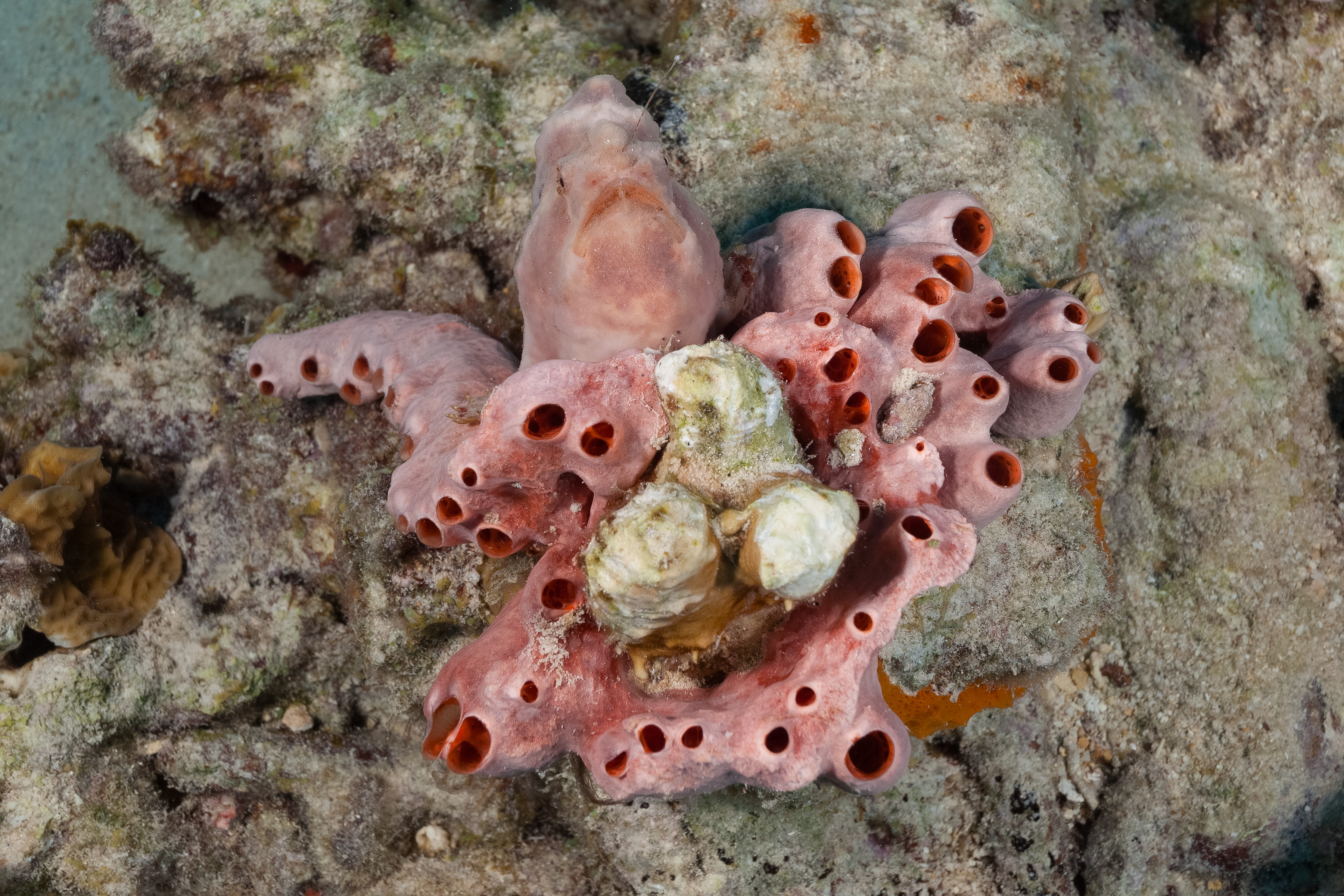 This Sponge is pink or pale pink with many branches and raised openings. Its interior is orange.