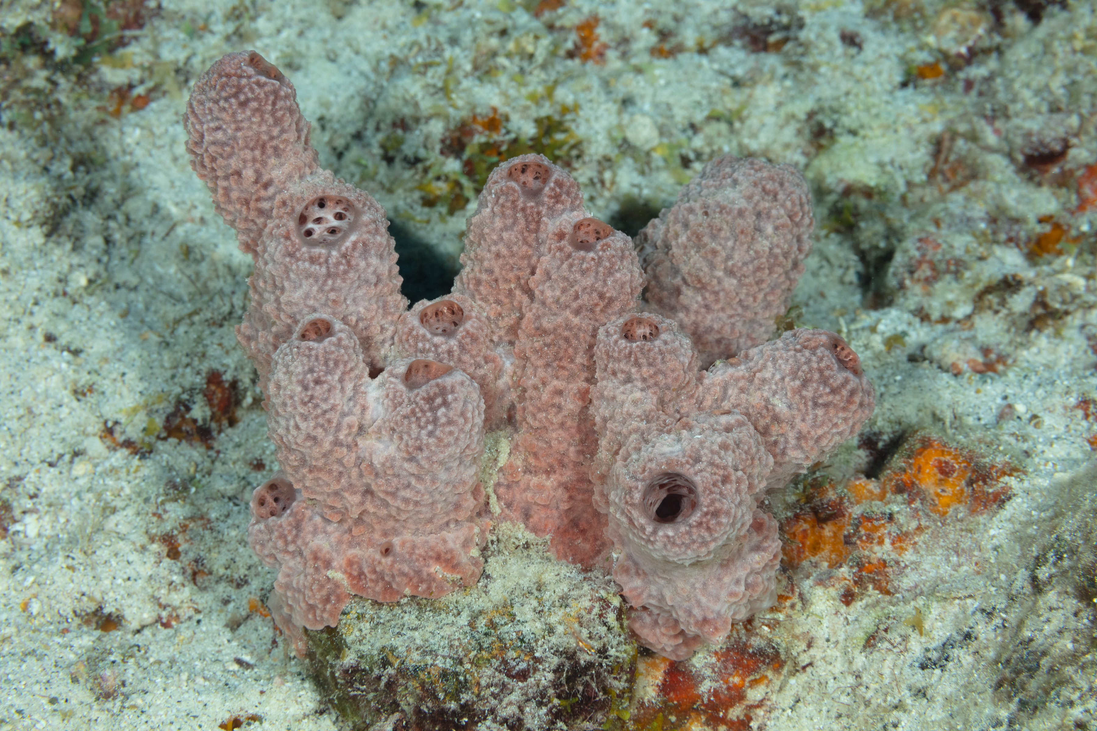This Sponge is pink or pale pink with many branches and raised openings. Its interior is orange.