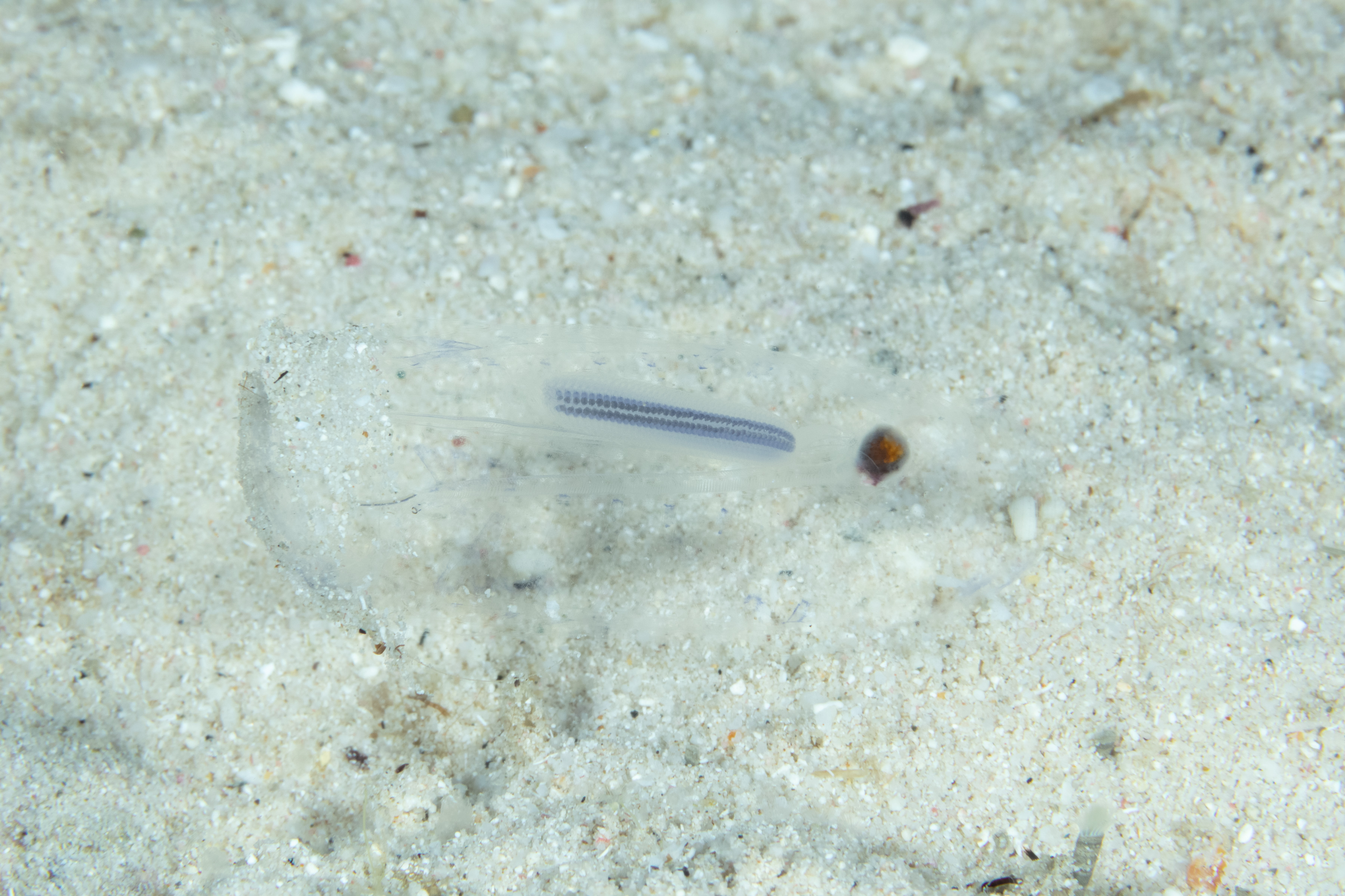 This Tunicate has a transparent, jelly-like body that resembles small, cylindrical tubes. It is often seen drifting in chains, with red markings along its surface.