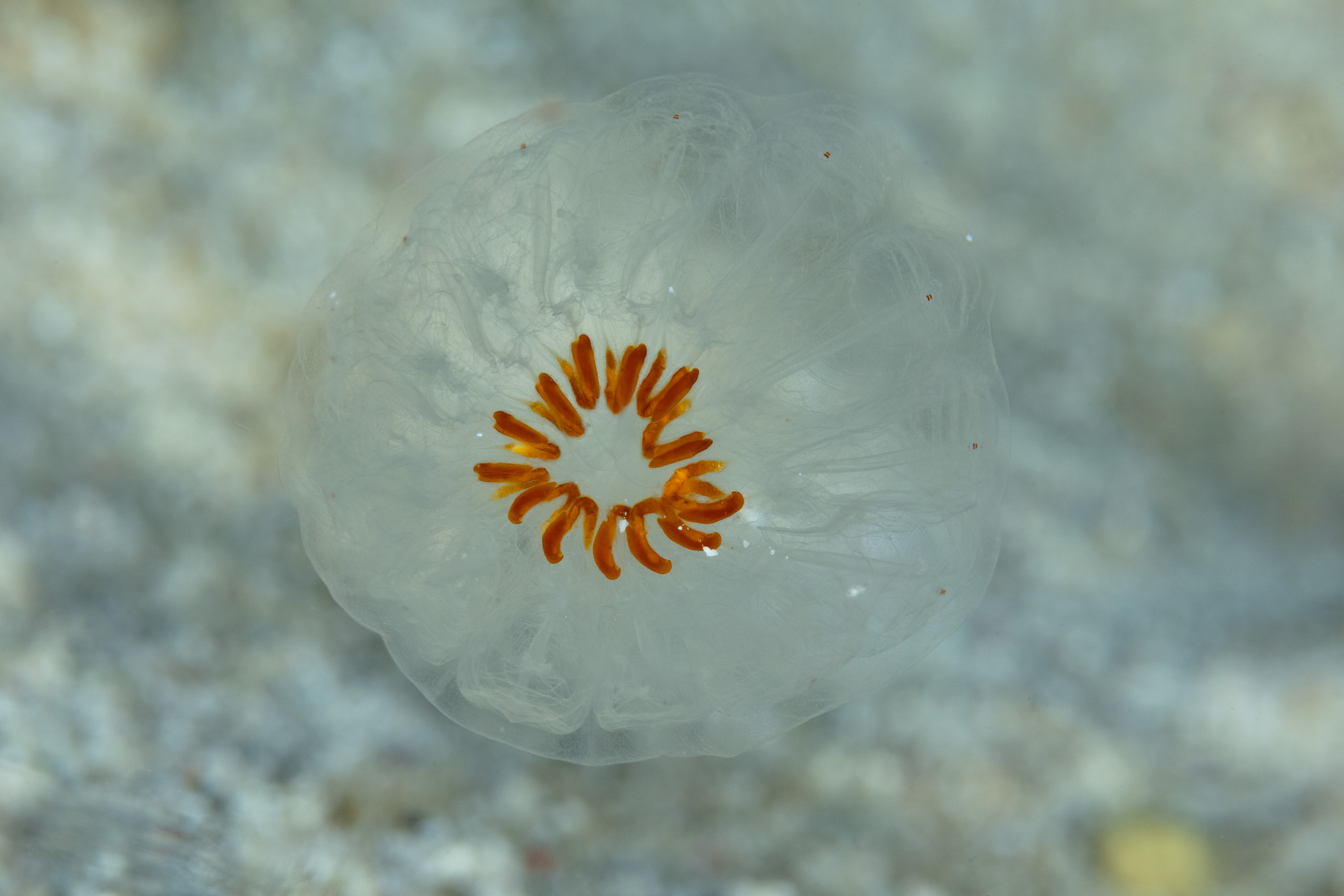This Tunicate has a transparent, jelly-like body that resembles small, cylindrical tubes. It is often seen drifting in chains, with red markings along its surface.