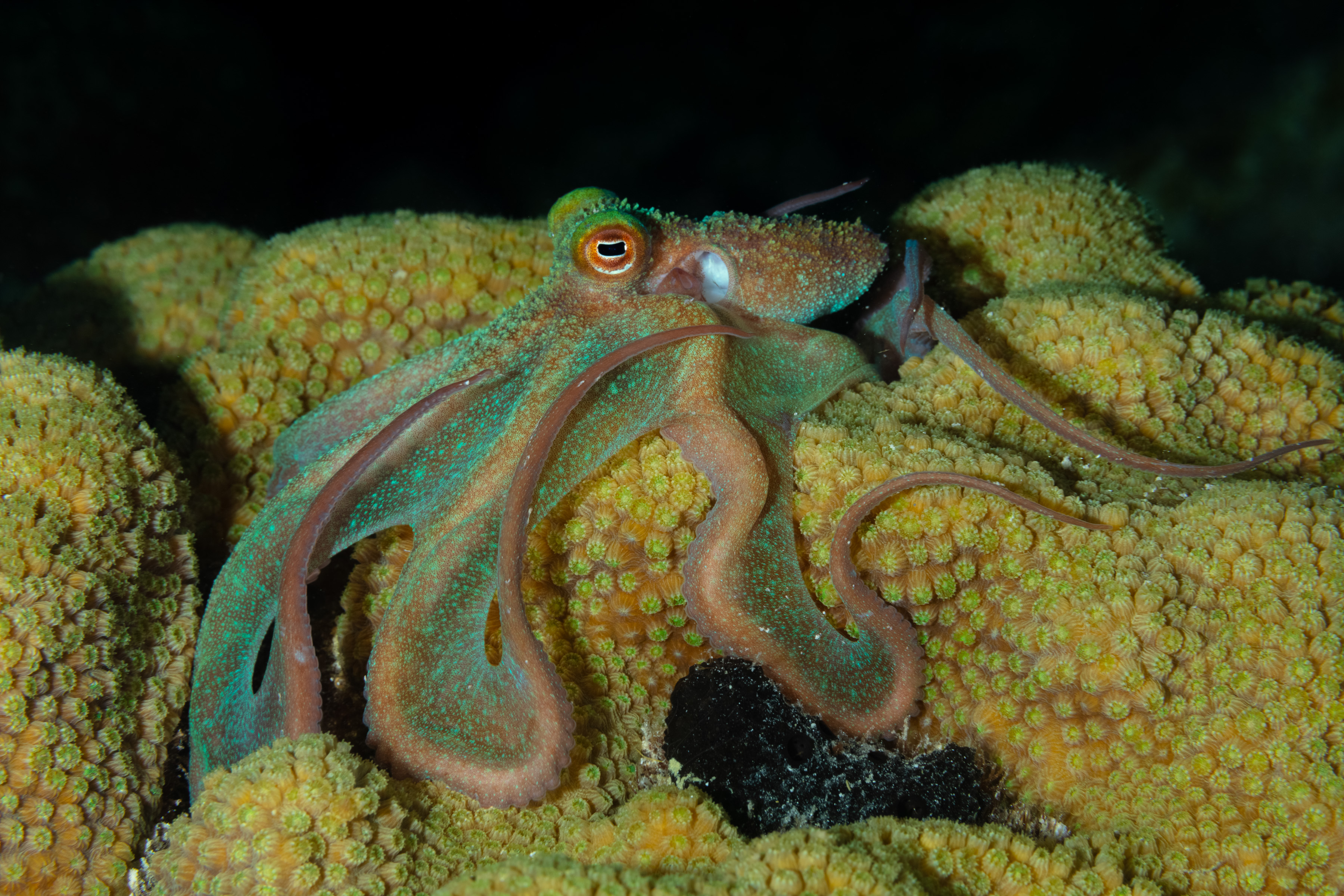 This Octopus has a smooth body, often showing iridescent blue-green shades mixed with reddish-brown patterns. Its eyes are large and it lacks a dark edge around its suckers.
