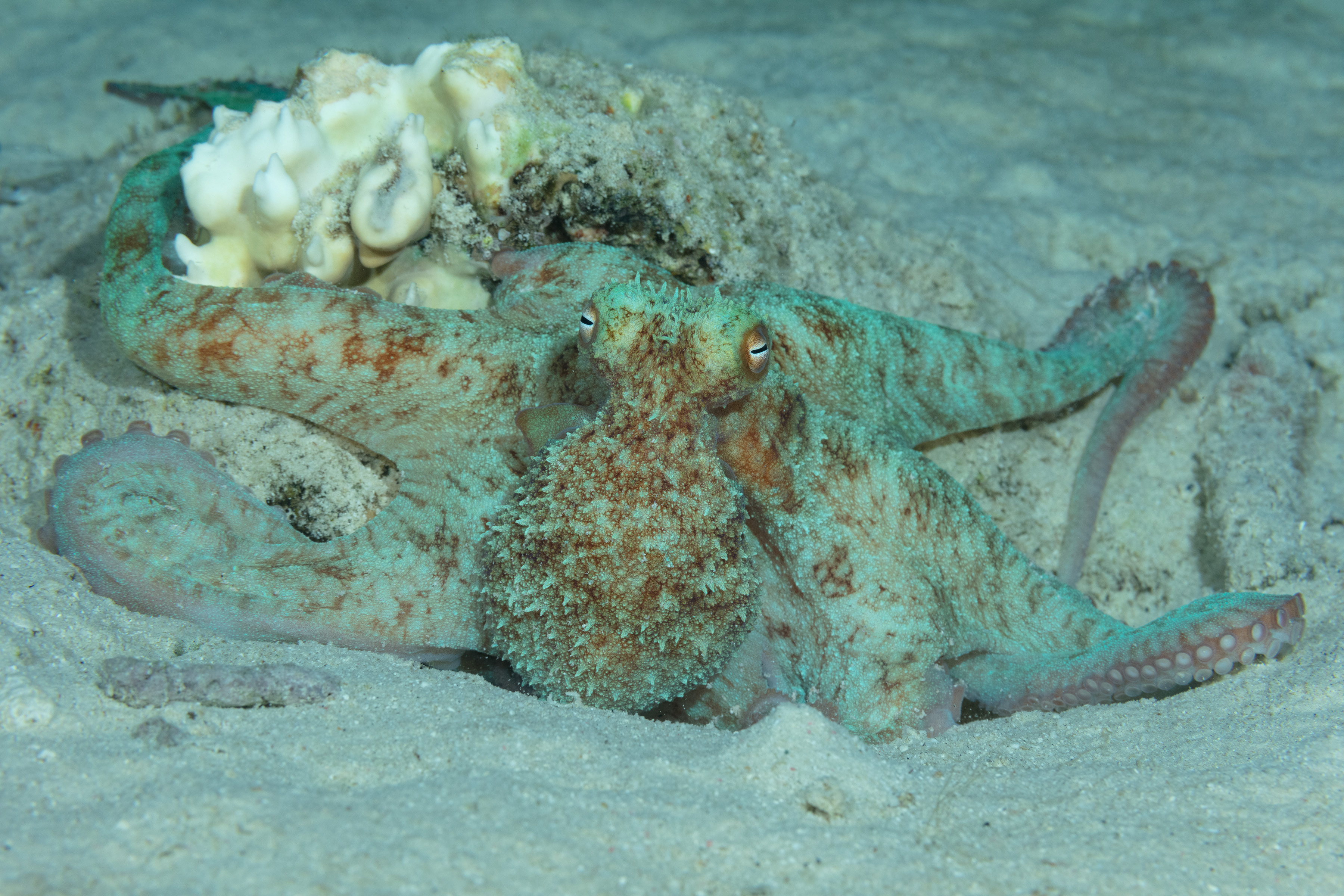 This Octopus has a smooth body, often showing iridescent blue-green shades mixed with reddish-brown patterns. Its eyes are large and it lacks a dark edge around its suckers.