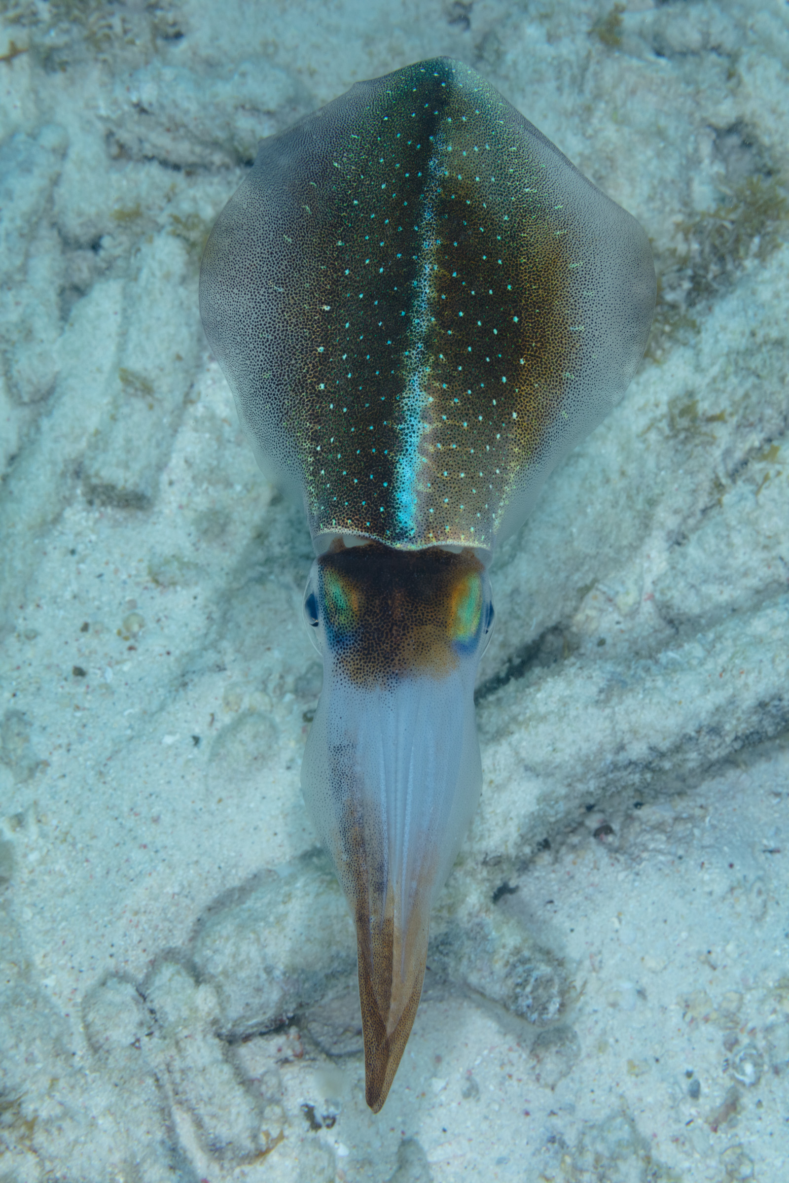 This Squid has a long, oval body. A thin fin runs along its sides and tapers to a point at the back. Its colors and patterns shift often, showing red to brown tones with flashes of blue and green.