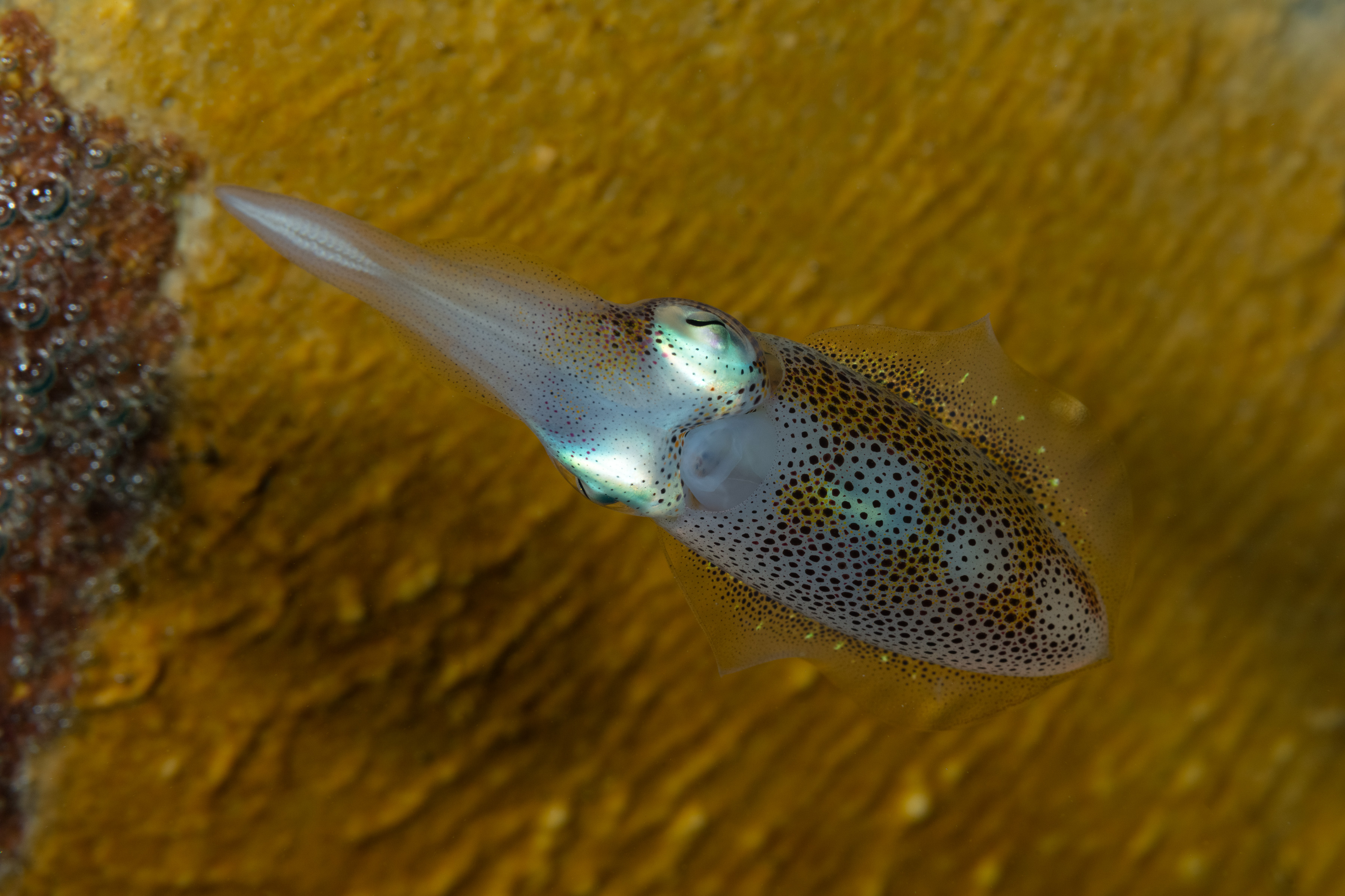 This Squid has a long, oval body. A thin fin runs along its sides and tapers to a point at the back. Its colors and patterns shift often, showing red to brown tones with flashes of blue and green.