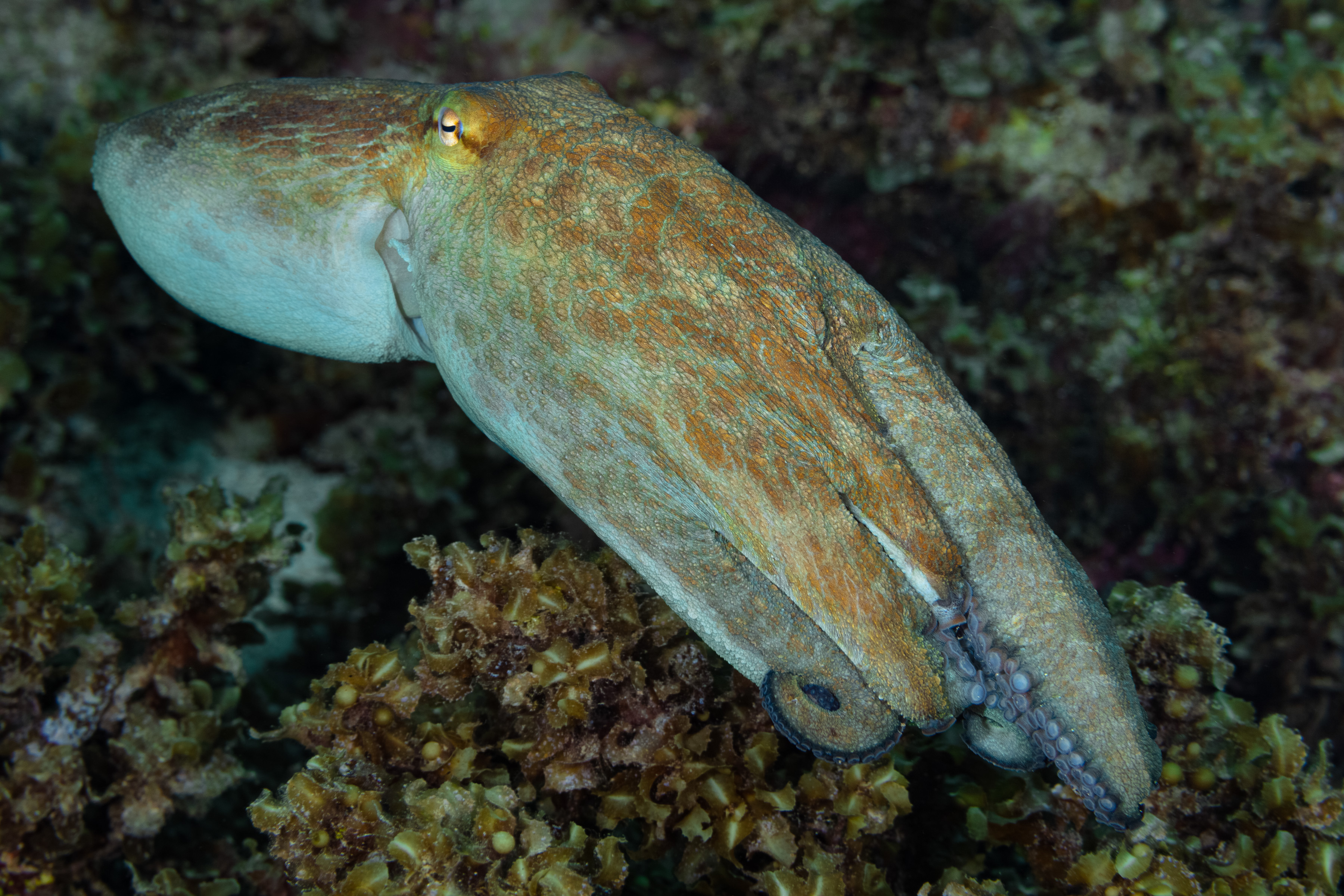 This Octopus can be found alone in shallow rocky areas or on the reef, hiding in crevices and is very cautious. It searches by poking, crawling, and probing with its arms, and it eats mostly small crabs and mollusks. Adults usually die after laying or caring for eggs. It was once confused with Octopus vulgaris (Common Octopus), but researchers have shown it is a different, unique species.
