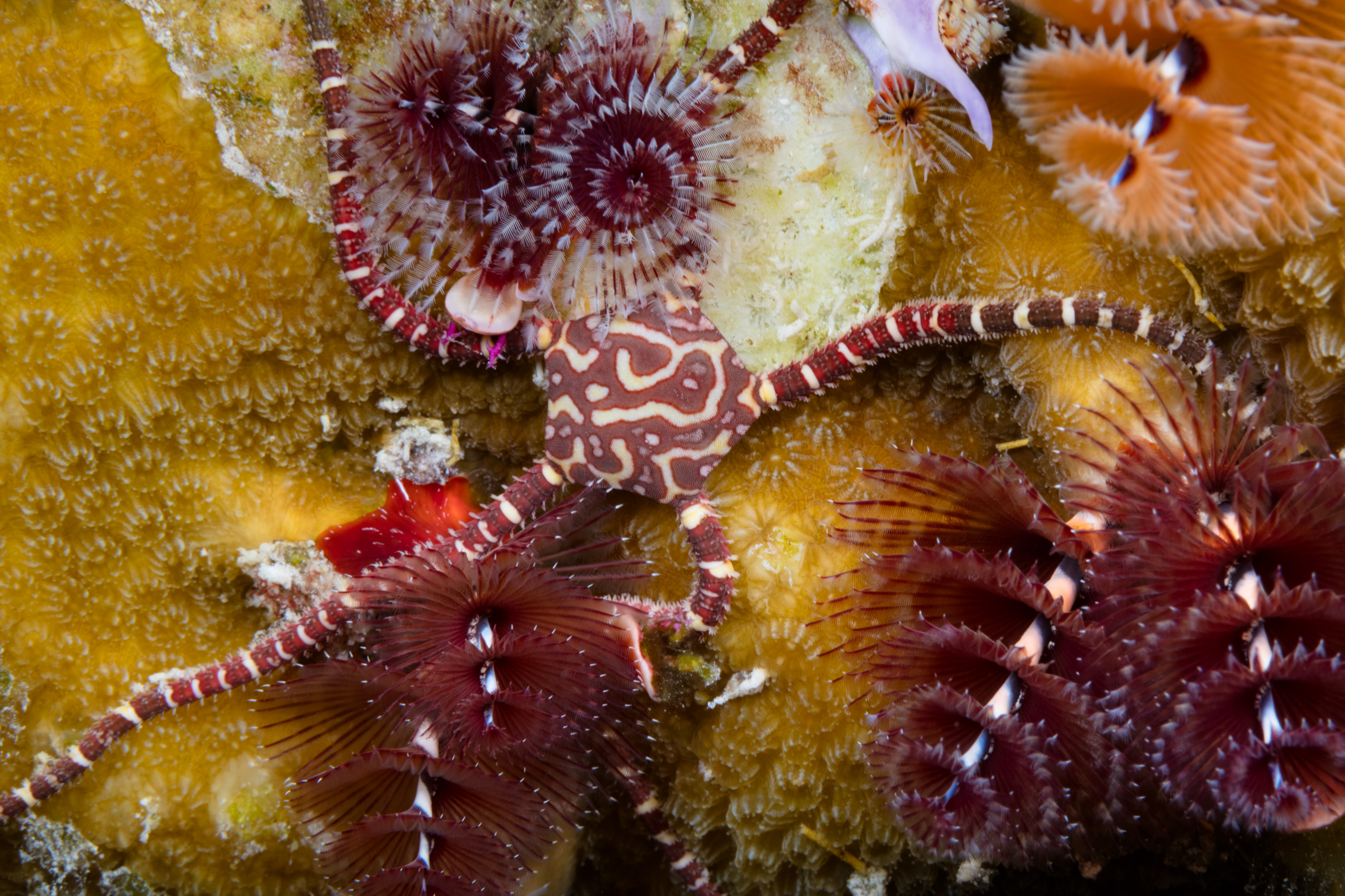 Unidentified Unidentified: This species has not been identified, as no name or classification could be determined from the available photo. The Brittle Star in this photo could be a Ruby Brittle Star. If you can identify this, please contact fishid@bonairereef.com