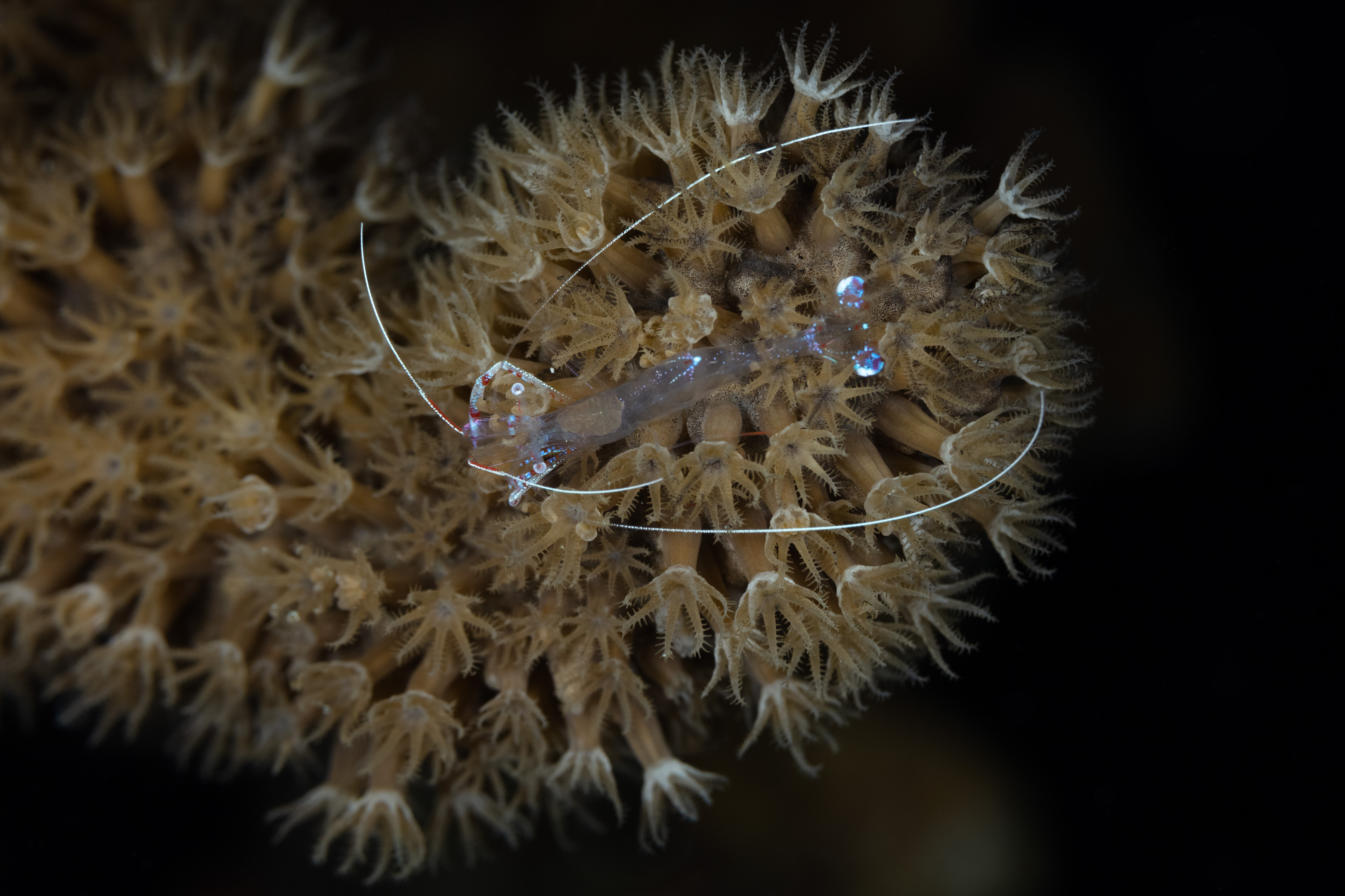 Unidentified Unidentified: This species has not been identified, as no name or classification could be determined from the available photo. This is a Clear Cleaner Shrimp, possibly a Spotted Cleaner Shrimp, but further review is necessary. If you can identify this, please contact fishid@bonairereef.com