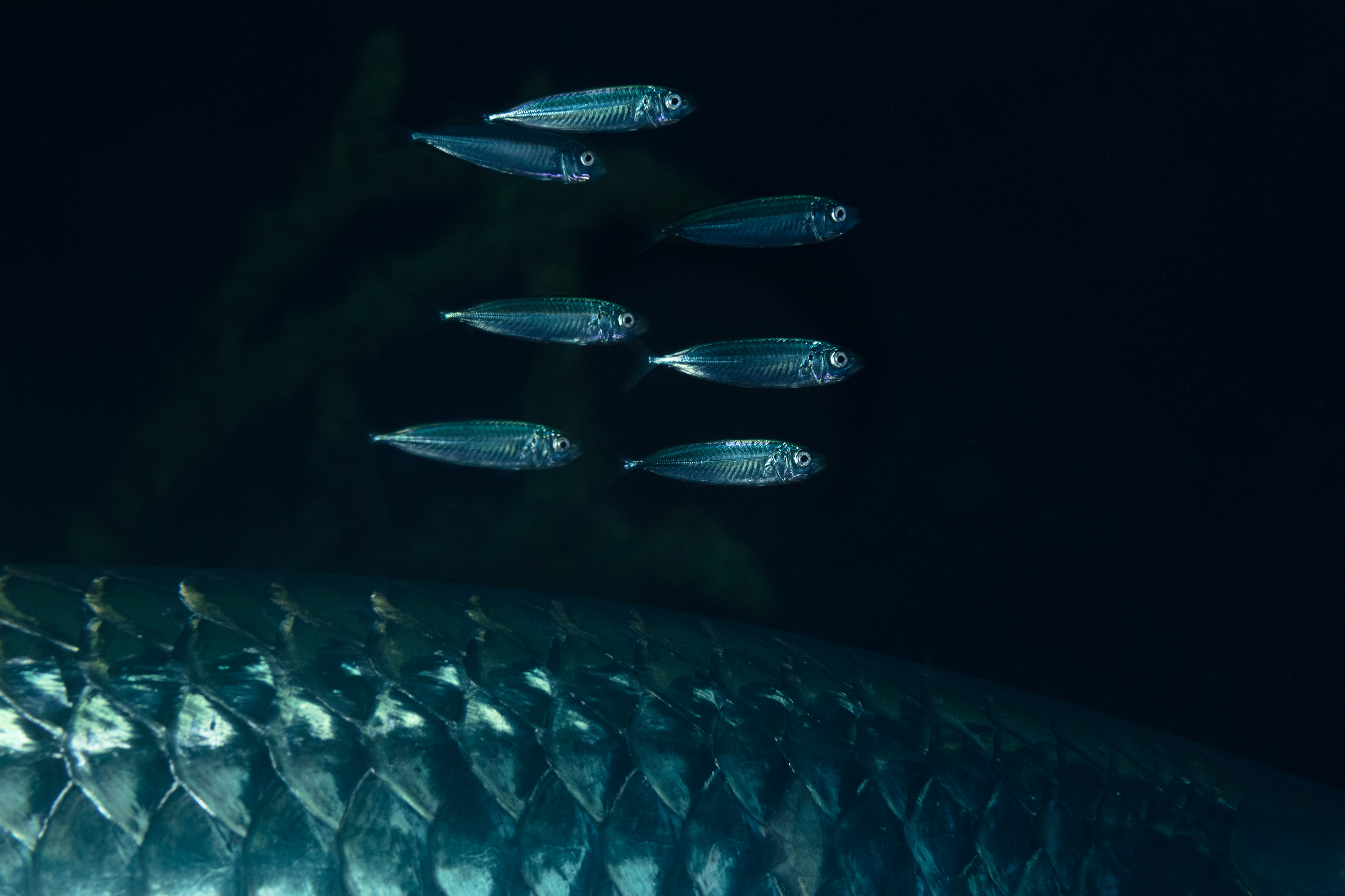 These are small silvery fishes (possibly little Round Scad) that can be seen in small groups following Tarpons or Barracudas.